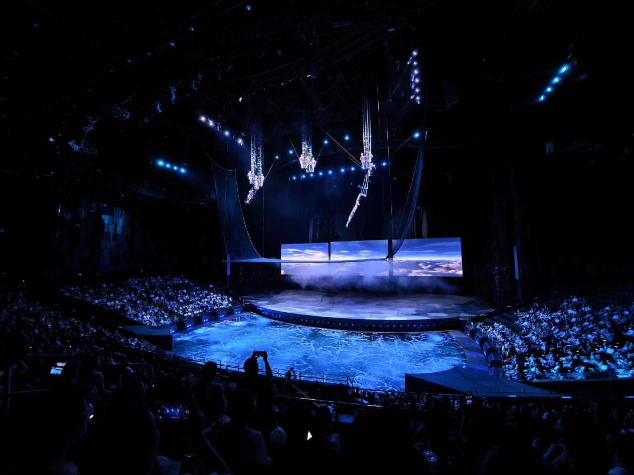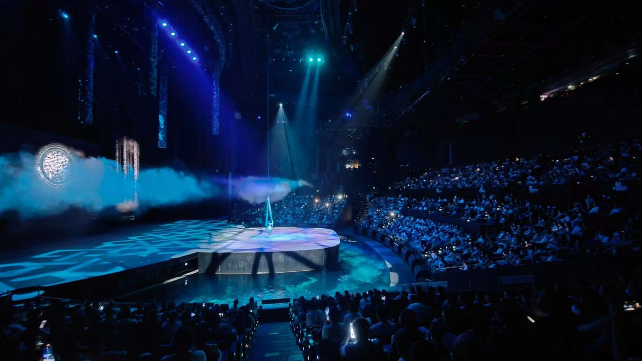 漢秀劇場(chǎng)版《水秀》融合了舞蹈、高空跳水、環(huán)球飛車、空中飛人、吊環(huán)、柔術(shù)等多種藝術(shù)表演形式,演員們?cè)诳罩?、水面和水下穿梭表演,呈現(xiàn)出一系列驚險(xiǎn)刺激、美輪美奐的場(chǎng)景,令臺(tái)下觀眾驚嘆不已,掌聲不斷。