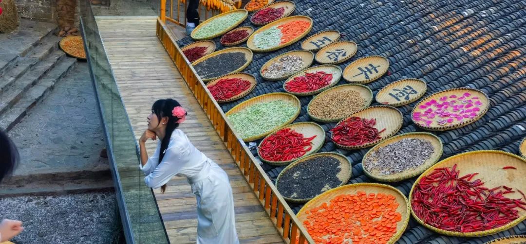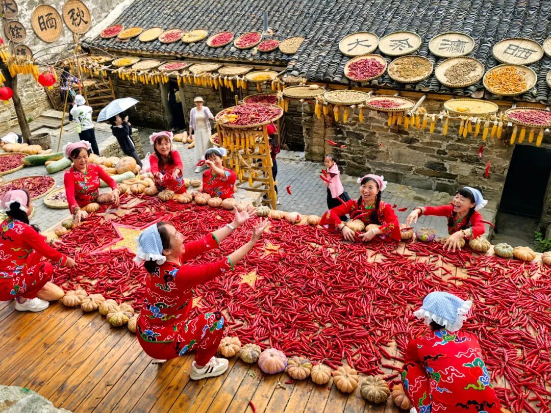 【豐收調(diào)色盤】登高遠(yuǎn)眺,整個(gè)古村宛如打翻的調(diào)色盤。辣椒紅、玉米黃、南瓜橙...在青瓦飛檐間鋪展成壯觀的豐收?qǐng)D卷。最佳攝影點(diǎn)已就位,等您收錄今秋最動(dòng)人的畫。