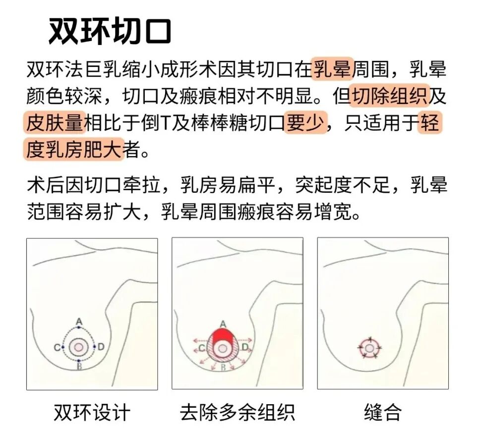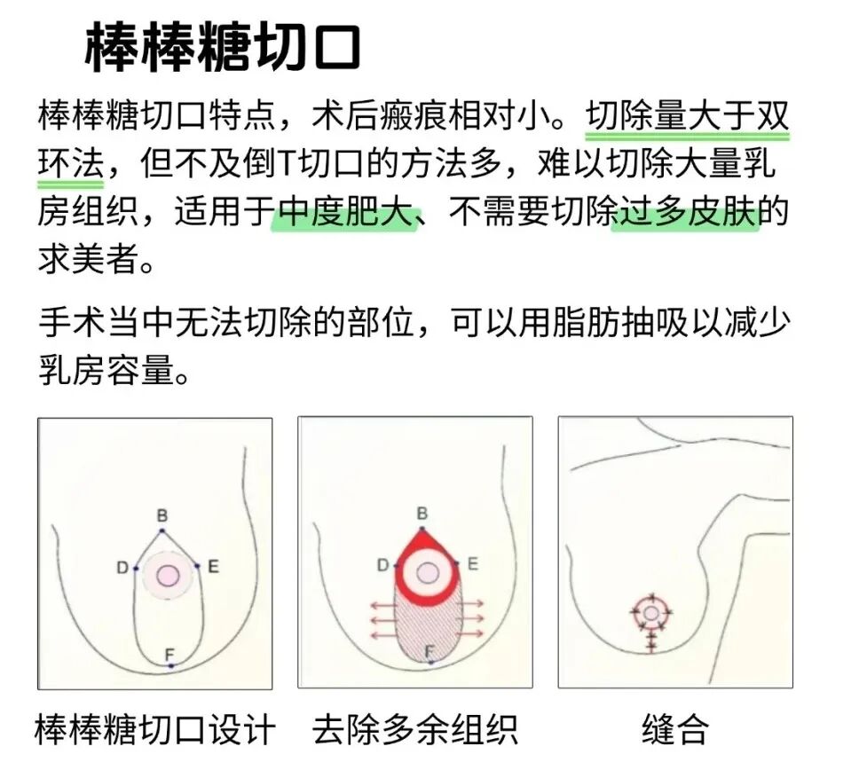 這是一種經(jīng)典的巨乳縮小術(shù)式。通過精心設(shè)計,去除多余的組織、脂肪和皮膚,并將乳頭乳暈復(fù)合體移位至新高點,最后縫合為一個圍繞乳暈的“棒棒糖”狀或垂直短瘢痕切口。