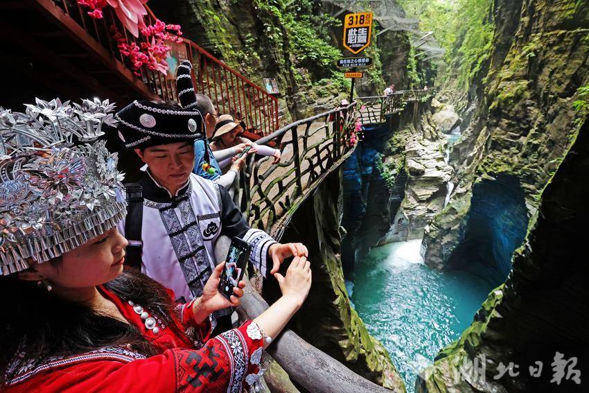 深入谷底,抵達被《中國國家地理》認證推薦的最佳取景位!該點位以天光一線、碧水環(huán)繞的天然畫框景觀著稱,為游客提供標準化取景平臺,可完整呈現峽谷地質奇觀與生態(tài)之美。