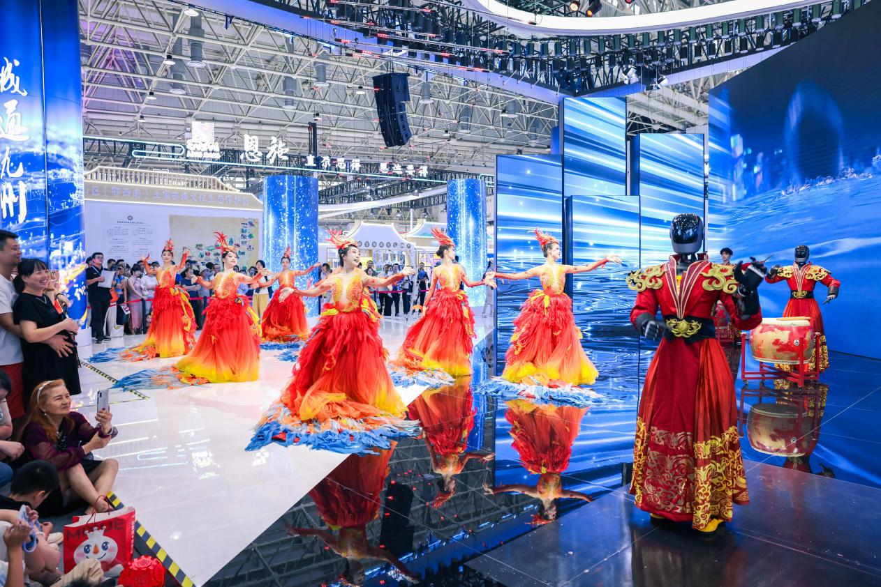 在展館內(nèi)外可以看到,各展區(qū)人頭攢動,在廣東長隆展區(qū),兩點半的演出還沒開始,人流已經(jīng)里三層外三層打圍。伴著強勁律動,外籍演員們還邀請觀眾共舞互動,現(xiàn)場氣氛爆棚。展館內(nèi)部,韓國館、陜西館等展位的熱舞、非遺展演成了焦點。多種多樣的智能設(shè)備體驗等,更成為小朋友的樂園。