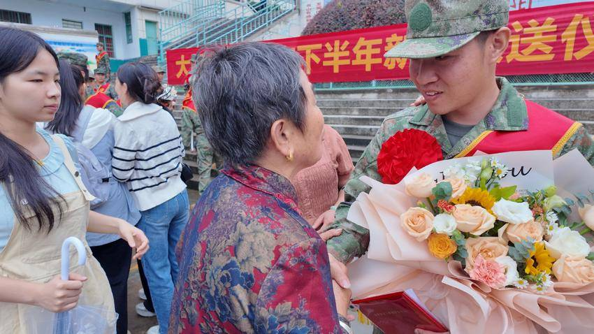 儀式在莊嚴(yán)的中華人民共和國國歌中拉開帷幕,禮山學(xué)校的學(xué)生代表向新兵送上鮮花,致敬最可愛的人,也為孩子們上了一堂最生動的國防教育課。工作人員為每位新兵贈送紅色書籍《大悟紅色記憶》,希望新兵在軍營中傳承大別山革命精神,賡續(xù)紅色血脈。隨后,全體新兵與家人們合影留念,一張張青春的臉龐、一個個堅定的眼神,定格成此刻最動人的畫面。