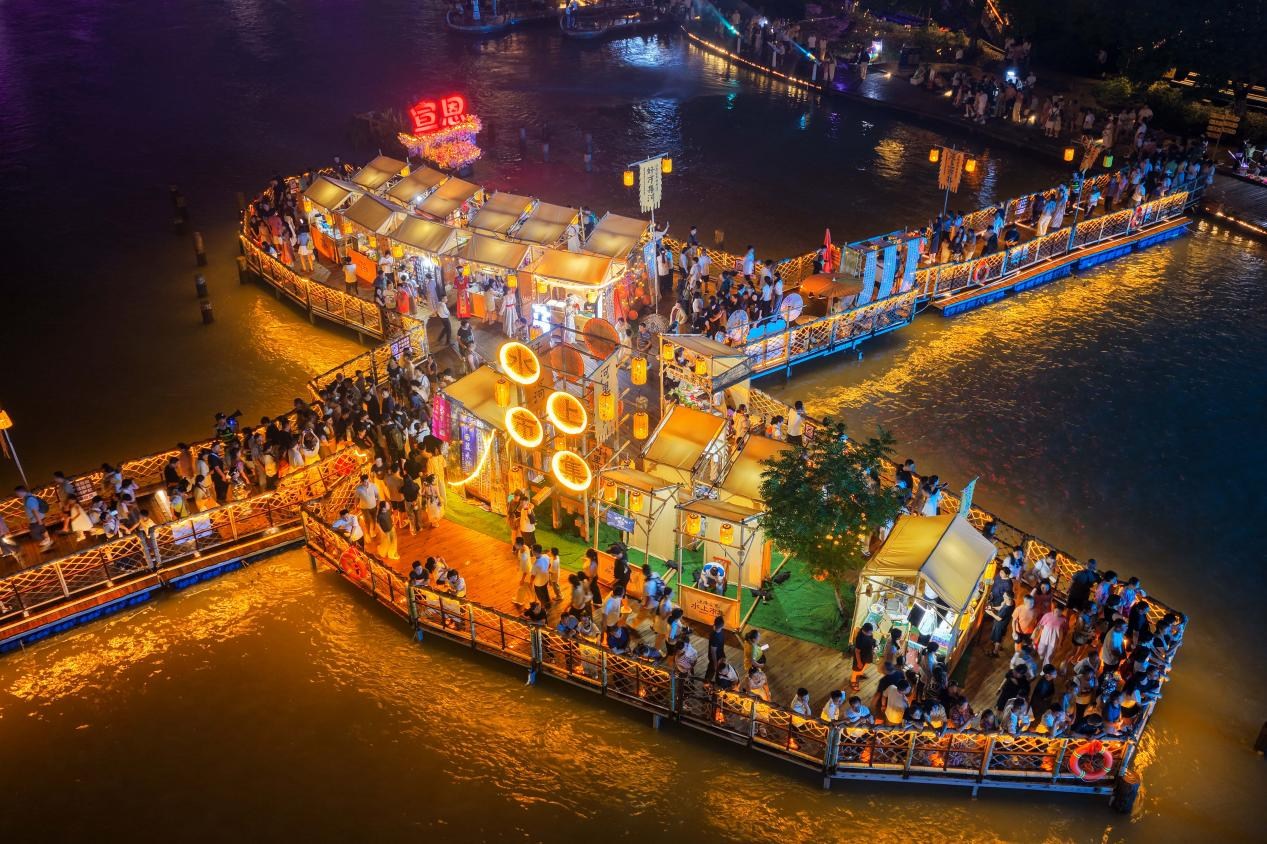 新大集拉動新消費。9月16日晚19:00至21:00,在恩施州宣恩縣城沿河兩岸開設(shè)特色水上市集,商家與NPC以特定古風(fēng)造型進(jìn)行集市售賣。形式新穎、文化元素突出,深受年輕消費者喜愛。家電、3C數(shù)碼、汽車等商品集中亮相,以舊換新、專項優(yōu)惠福利、促銷大禮包抽獎等各類活動持續(xù)推出,現(xiàn)場消費火熱。