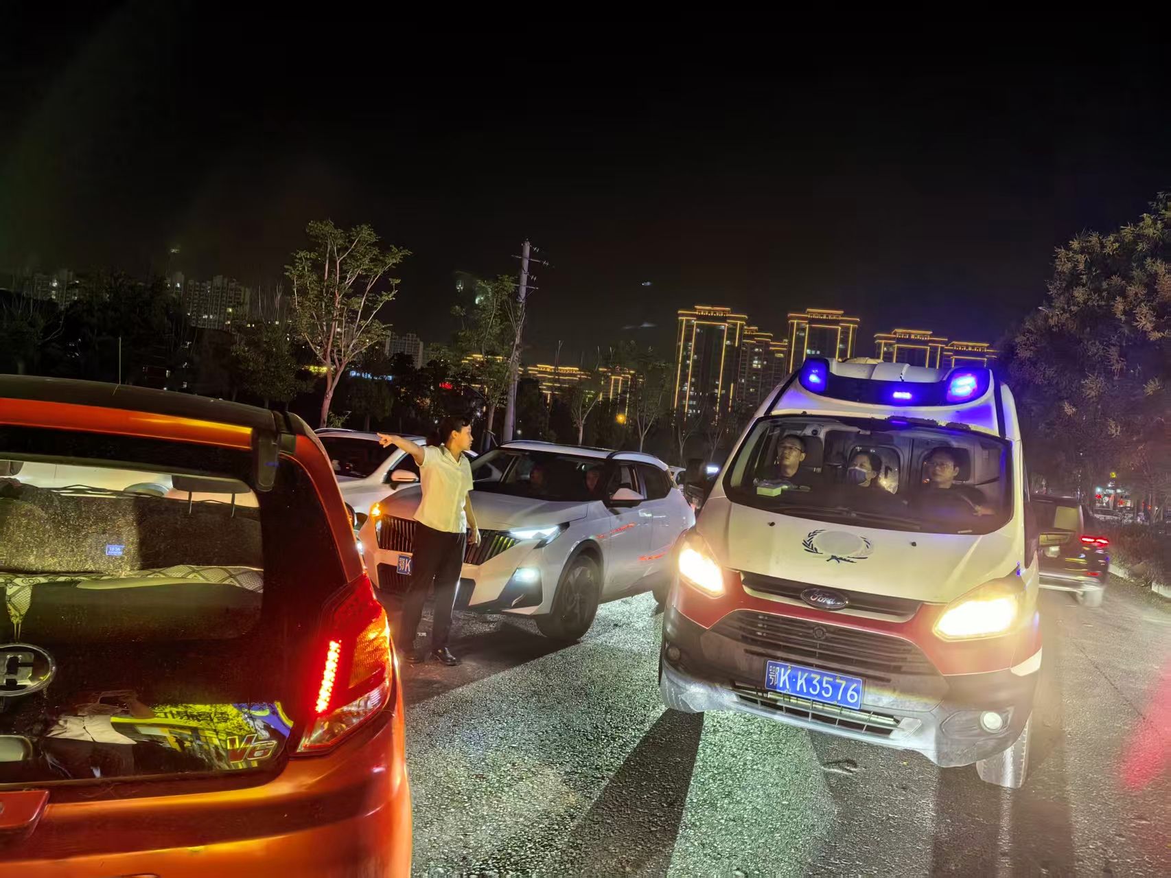 在等待救護(hù)車的過程中,兩人始終堅(jiān)守在現(xiàn)場(chǎng)。看到事故現(xiàn)場(chǎng)周邊過往車輛逐漸增多,為避免二次事故發(fā)生,他們主動(dòng)站在道路兩側(cè),揮手引導(dǎo)車輛減速避讓,維護(hù)現(xiàn)場(chǎng)交通秩序。幾分鐘后,救護(hù)車呼嘯而至,兩人又第一時(shí)間協(xié)助醫(yī)護(hù)人員查看傷者狀況,合力將傷者小心翼翼地抬上救護(hù)車,直到救護(hù)車順利駛離,他們才放心離開。