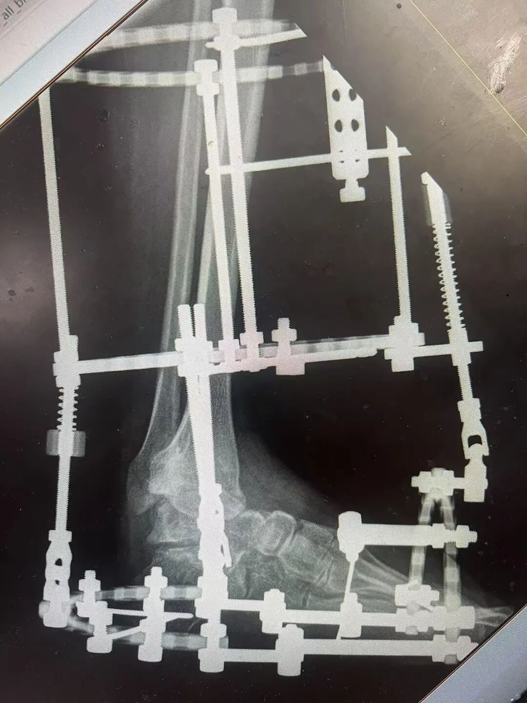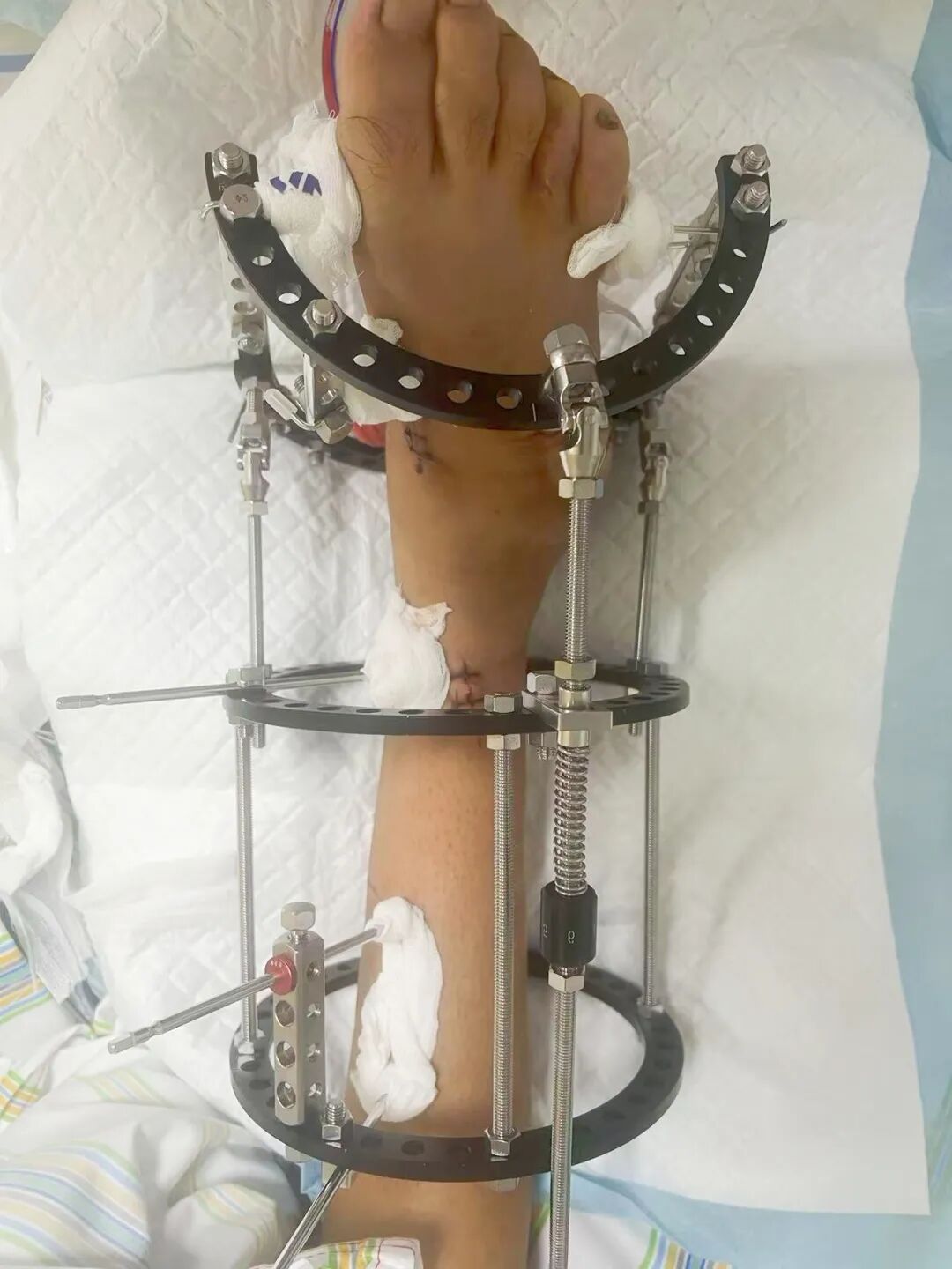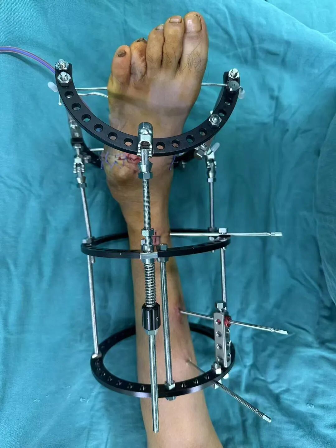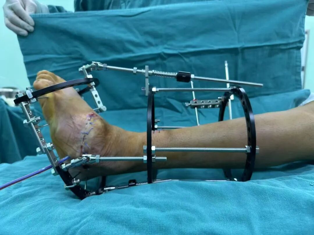 針對(duì)陽(yáng)先生的復(fù)雜情況,鄭群龍醫(yī)師團(tuán)隊(duì)制定了詳盡的手術(shù)方案:左踝關(guān)節(jié)融合+馬蹄足畸形矯正+跟腱延長(zhǎng)+外固定架固定術(shù)。手術(shù)的核心,正是伊里扎洛夫技術(shù)。這項(xiàng)技術(shù)如同精密的“時(shí)空建筑學(xué)”,通過微創(chuàng)安裝環(huán)形外固定架,前足-后足安裝鋼環(huán),再將足的鋼環(huán)與脛骨的固定鋼環(huán)在踝關(guān)節(jié)前、后、左、右用帶關(guān)節(jié)的螺紋桿連接,由此構(gòu)建成一個(gè)能體外牽拉調(diào)控的三維立體構(gòu)型,在術(shù)后進(jìn)行精準(zhǔn)、緩慢的調(diào)整,一寸一寸逐步將畸形的骨骼、軟組織恢復(fù)到正常位置。