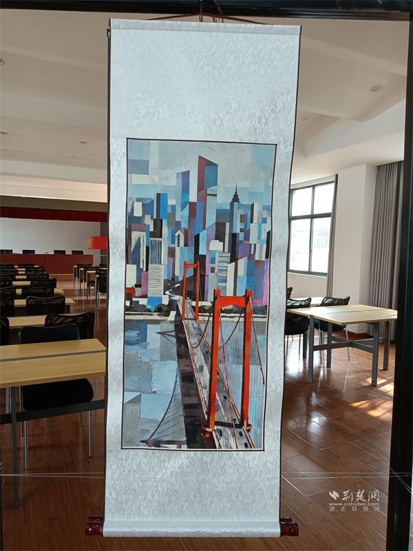 在成年人作品展示區(qū),一幅采用微噴打印技術(shù)的作品,采用色塊拼接的藝術(shù)手法,巧妙地將鸚鵡洲長江大橋與密集的高層建筑群相結(jié)合,共同勾勒出現(xiàn)代都市的壯麗景觀。另外一幅作品以工筆勾線為基礎(chǔ),結(jié)合平涂與暈染技法,生動呈現(xiàn)黃鶴樓下高速列車飛馳而過的畫面,實現(xiàn)了“古今”時空對話的獨特場景。此外,還有融合素描與水彩技法的作品,以寫實風(fēng)格還原炭廠角省船宿舍的共享空間,傳遞出寧靜院落的生活氣息?!敖窒镄骂佊吵枴焙汀班徖锴闈鈩俅簳煛钡葧炎?,以獨特的藝術(shù)形式彰顯了傳統(tǒng)文化的深厚魅力。