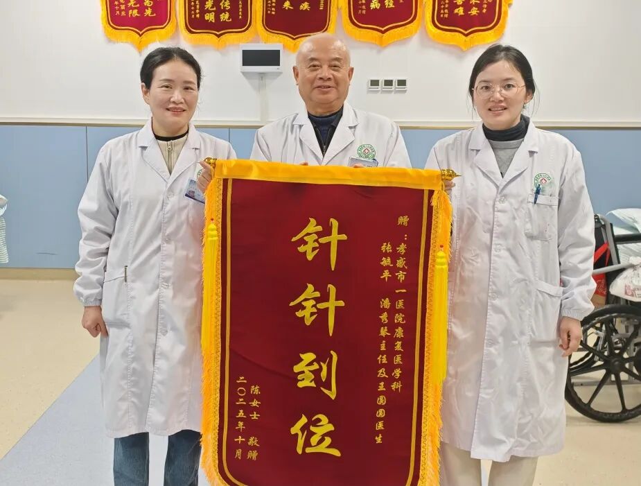 荊楚網(wǎng)(湖北日報網(wǎng))訊(通訊員 潘秀琴)10月28日,孝感市第一人民醫(yī)院康復醫(yī)學科的診室里暖意融融,患者陳女士將兩面分別繡有“針針到位”“仁心仁德好醫(yī)生 全心全意為患者”的鮮紅錦旗鄭重送到醫(yī)護人員手中,感謝該科團隊用精湛醫(yī)術與暖心照護助其重返健康生活。
