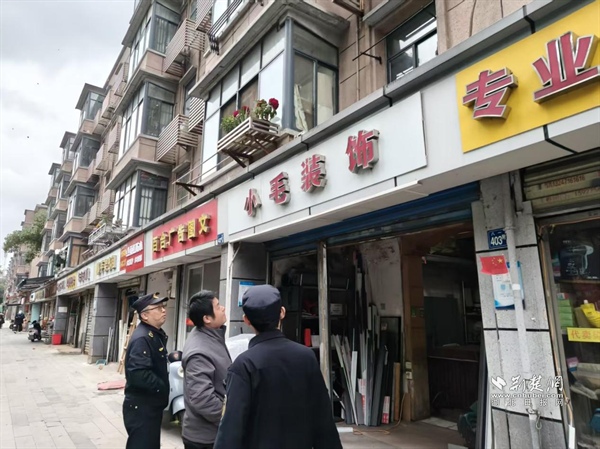 執(zhí)法中心工作人員排查轄區(qū)廣告招牌安全隱患。 通訊員供圖