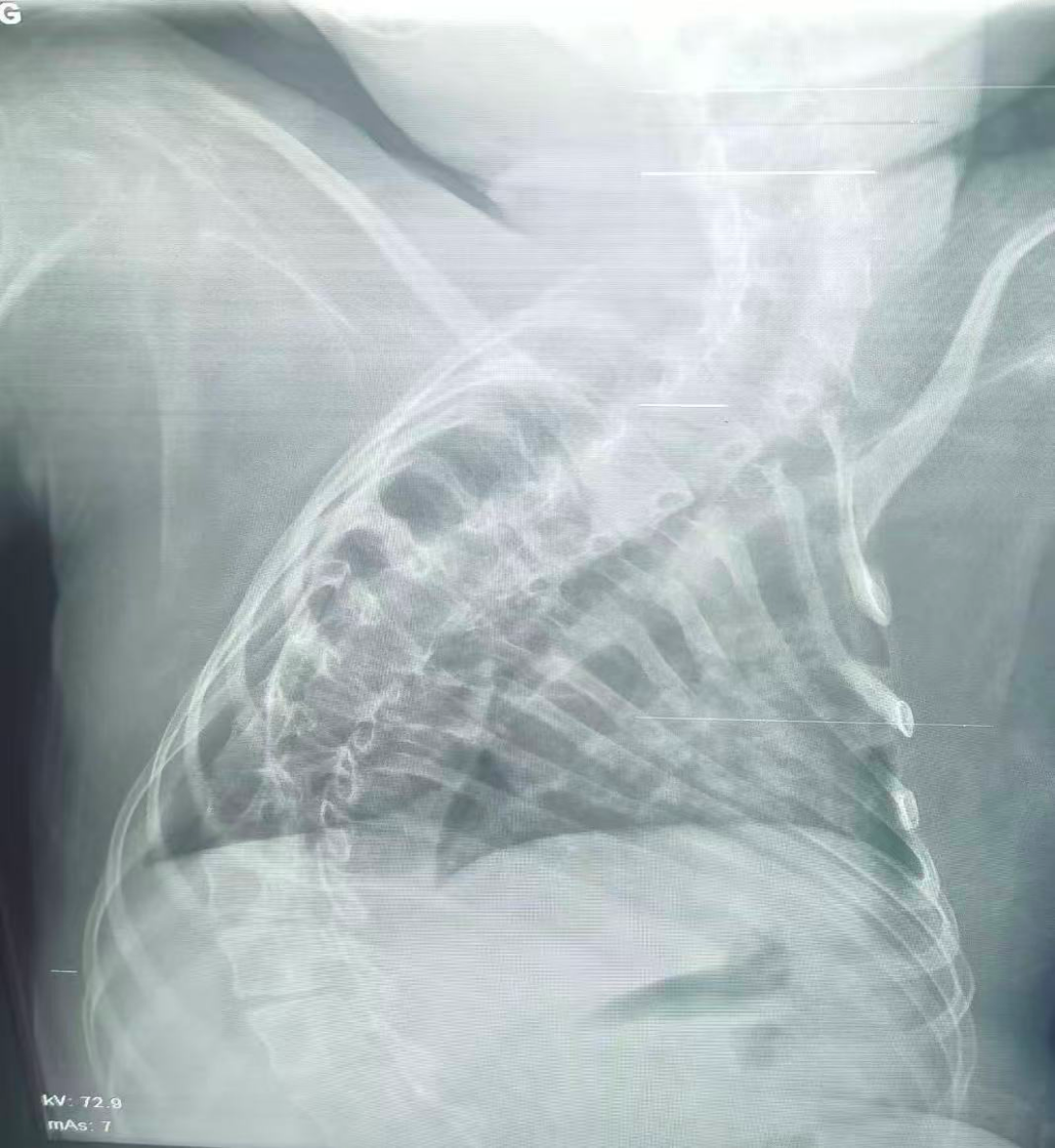 該患兒因患脊髓性肌萎縮癥長期臥床,呼吸肌已嚴重?zé)o力,自主呼吸微弱且?guī)缀鯁适Э人耘盘的芰?,此次并發(fā)支氣管肺炎后,肺部感染迅速加重,生命已然懸于一線。更棘手的是,嚴重的脊柱側(cè)彎使患兒胸廓畸形、氣道解剖結(jié)構(gòu)明顯移位,常規(guī)纖支鏡進鏡路徑完全失效,扭曲狹窄的氣道如同縱橫交錯的“迷宮”,每一步操作都必須精準到毫米級別。