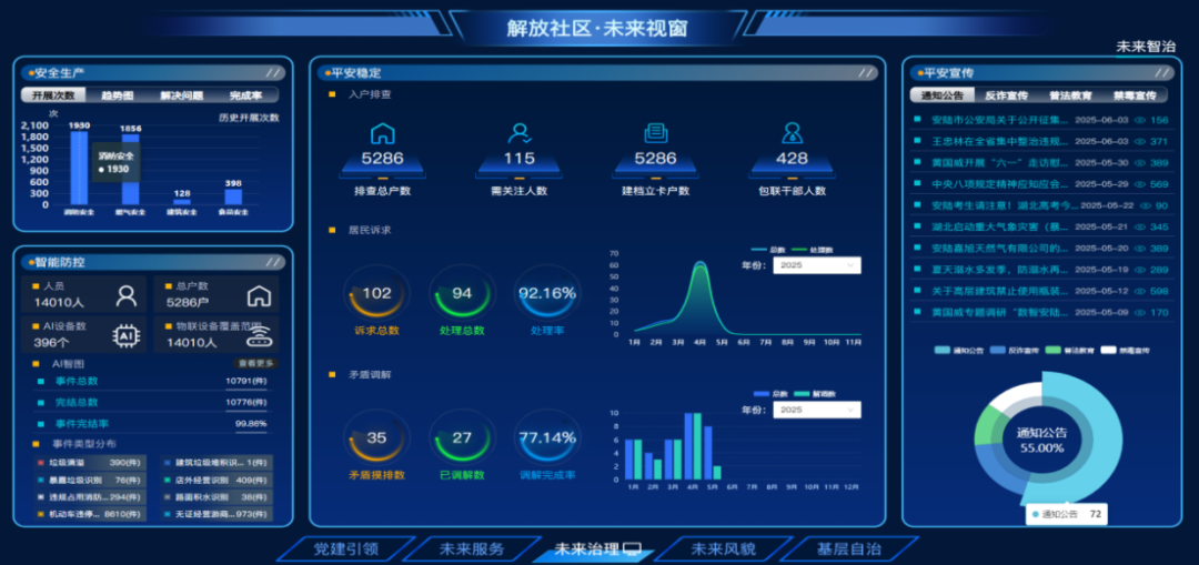 解放社區(qū)以“大屏統(tǒng)覽、中屏增效、小屏便民”三維智治體系為核心,夯實未來社區(qū)的數(shù)字根基?!按笃痢币劳腥?96臺智能設(shè)備與實景建模,實現(xiàn)對防溺水、高空拋物等20類風(fēng)險的智能感知與實時預(yù)警,構(gòu)建“天上看、地上查、網(wǎng)上管”的立體防控網(wǎng);“中屏”打通數(shù)據(jù)壁壘,支持29類字段精準(zhǔn)檢索與一鍵報表,將社區(qū)干部從重復(fù)勞動中解放出來,專注下沉服務(wù);“小屏”則以微信小程序集成13類服務(wù)場景,居民通過“隨手拍”“一鍵派單”“項目投票”等功能,實現(xiàn)“指尖參與、即時響應(yīng)”。系統(tǒng)運行以來,事件平均處置時間由2小時壓縮至30分鐘,信息填報效率提升80%,預(yù)警處置率達(dá)100%,智慧治理效能顯著。