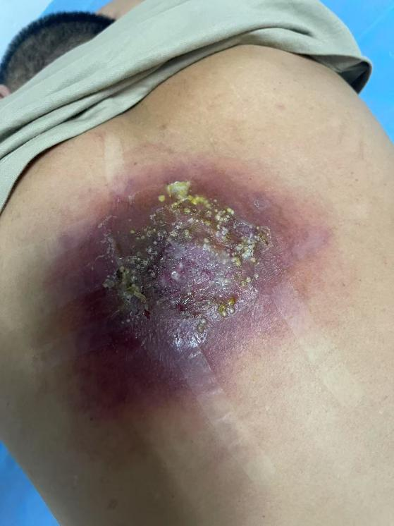 2025年10月,在三亞務(wù)工的王先生背部突然出現(xiàn)包塊,隨即發(fā)展為紅腫破潰,伴隨劇烈疼痛。盡管在當(dāng)?shù)蒯t(yī)院接受了12天治療,病情卻持續(xù)惡化:創(chuàng)面不斷擴(kuò)大,還出現(xiàn)全身乏力、精神萎靡等癥狀。意識(shí)到情況危急,他毅然決定轉(zhuǎn)回家鄉(xiāng)孝感市中心醫(yī)院尋求治療。