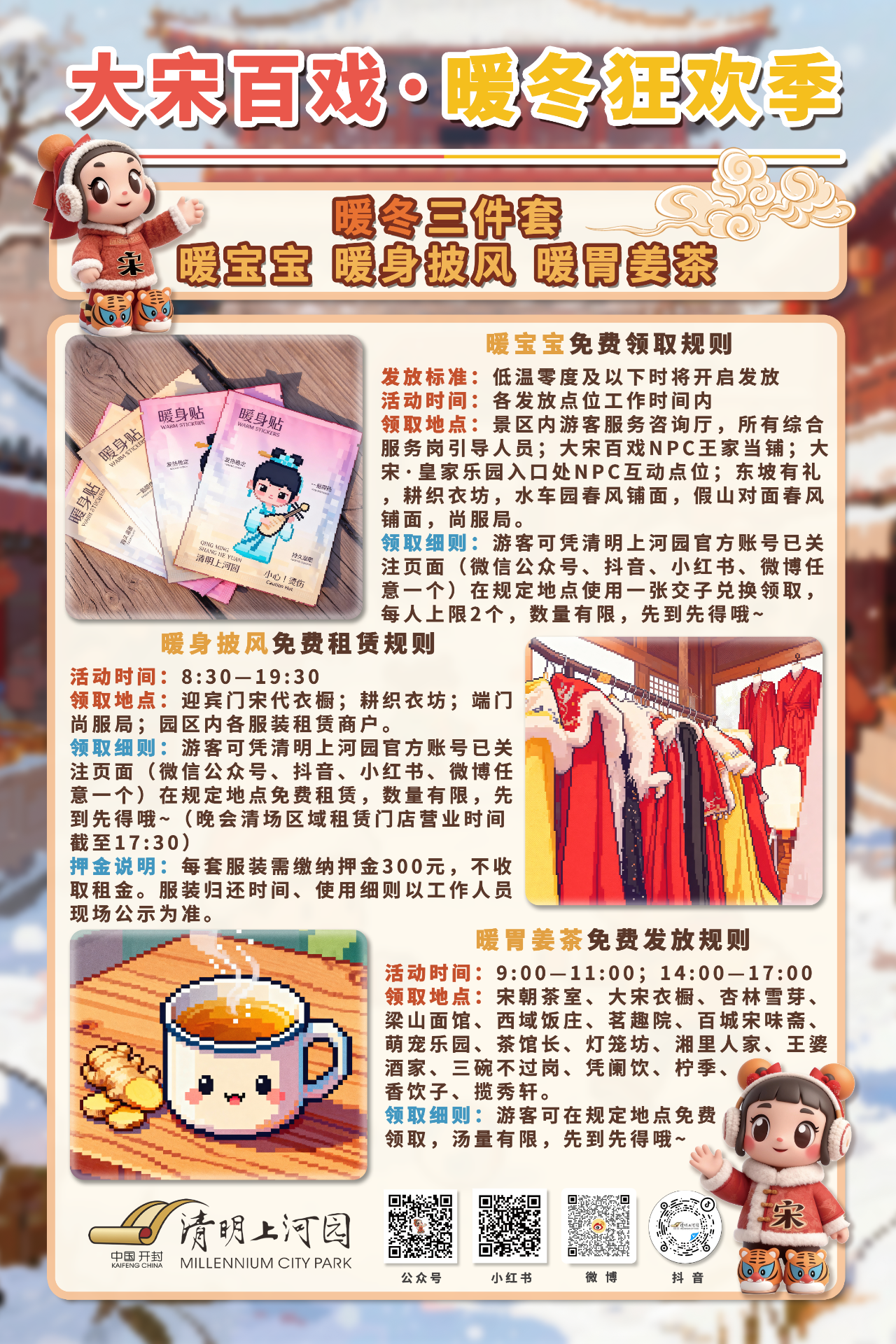 寒風再冷,也抵不過我們貼心的寵愛!清明上河園暖冬三件套,暖寶寶、熱乎姜茶、溫暖披風免費享!這個冬天,在清明上河園,就要從手暖到心!