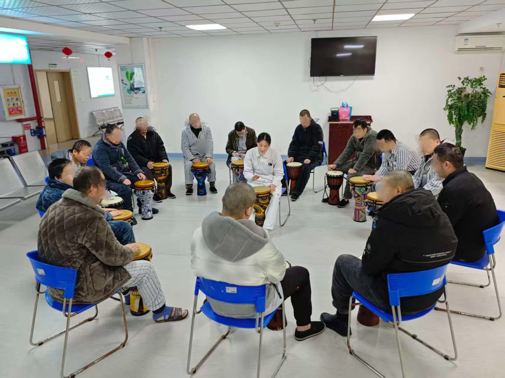 “鼓圈就像一個(gè)包容又充滿力量的‘聯(lián)結(jié)圈’,我在鼓點(diǎn)的共振中釋放了積壓的壓力,情緒也得到了有效舒緩。跟著治療師的動(dòng)作節(jié)奏,心慢慢沉進(jìn)當(dāng)下的節(jié)拍里,真切體會(huì)到了‘同頻’的默契,特別踏實(shí)安心?!?一位患者在活動(dòng)后真誠(chéng)分享。這種沉浸式的參與體驗(yàn),能夠有效喚醒患者的內(nèi)在動(dòng)力,助力他們?cè)谧灾髡瓶氐墓?jié)奏中實(shí)現(xiàn)心理調(diào)適與社會(huì)功能修復(fù)?;颊邆?cè)谶@場(chǎng)節(jié)奏互動(dòng)中,不僅感知到聽覺、觸覺、視覺的多維聯(lián)動(dòng),更在“即興創(chuàng)作”與“節(jié)奏共鳴”中,尋得情緒疏解的有效出口,自信心與自我認(rèn)同感也得到了顯著提升。
