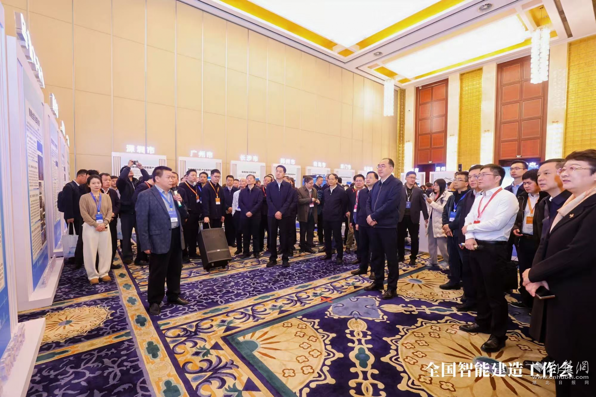會(huì)前,與會(huì)代表集中觀摩了全國智能建造試點(diǎn)城市成果展。在參觀武漢市智能建造三年成果展板時(shí),住房城鄉(xiāng)建設(shè)部副部長(zhǎng)李曉龍認(rèn)真聽取了武漢市關(guān)于“科技+產(chǎn)業(yè)+人才”一體化發(fā)展新模式及智能建造新生態(tài)建設(shè)情況的匯報(bào),對(duì)武漢在推動(dòng)建筑業(yè)轉(zhuǎn)型升級(jí)方面的實(shí)踐成效給予了充分肯定。