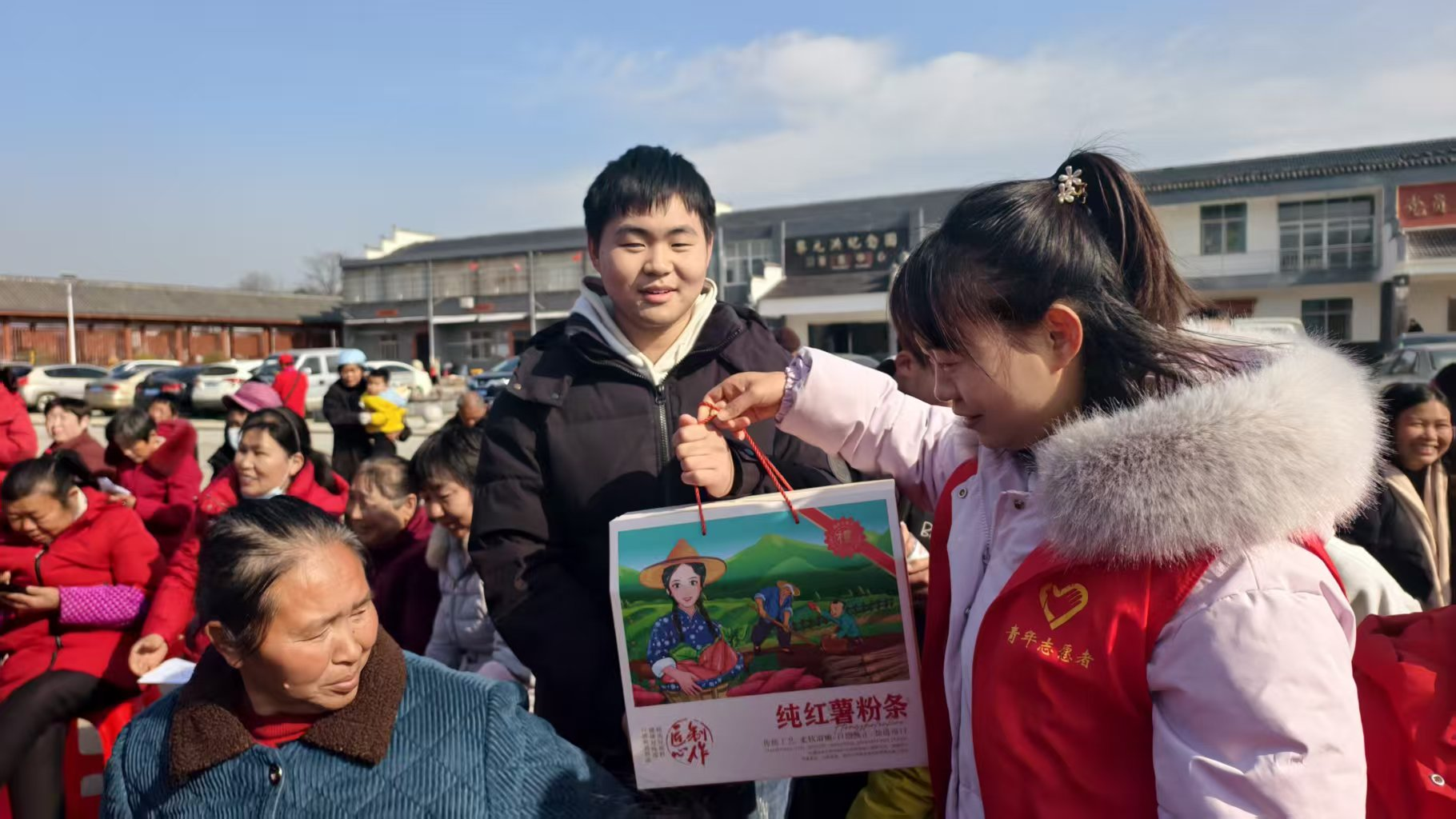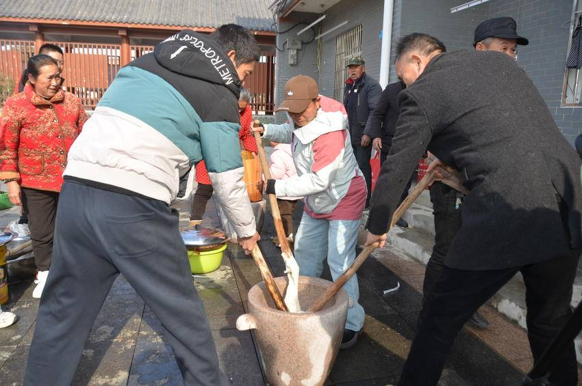 舞臺一側(cè)是“彭店好物”農(nóng)產(chǎn)品展銷臺,彭店鄉(xiāng)的大米、生態(tài)禽蛋、手工粉絲、花生等特色農(nóng)產(chǎn)品琳瑯滿目,人頭攢動,大家紛紛選購自己喜歡的年貨,最吸引的人是游客與村民一起打糍粑,品嘗自己親手打出來的糍粑,體驗鄉(xiāng)村濃濃的年味,一場文旅盛宴帶動彭店土特產(chǎn)品出圈出村。