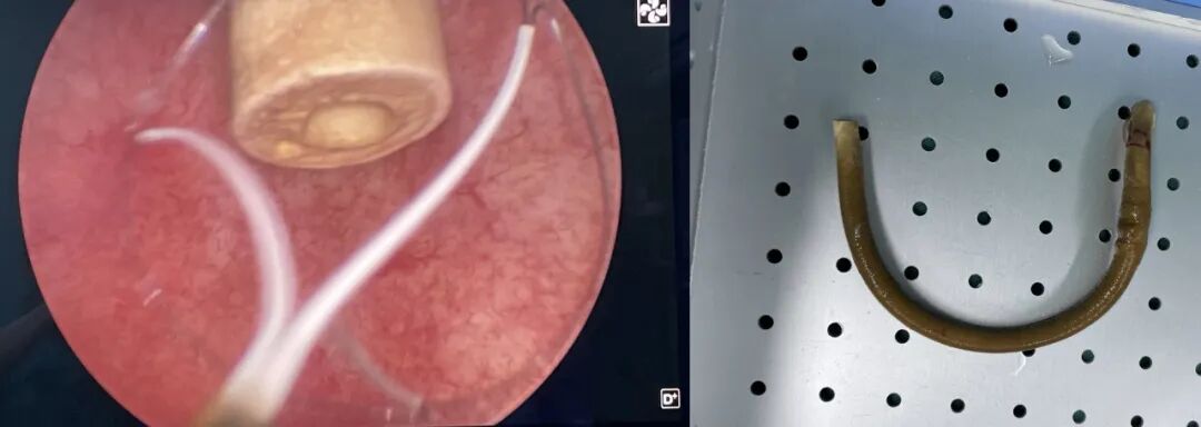 然而,在膀胱鏡檢查術(shù)中,醫(yī)生發(fā)現(xiàn)這根異物竟是半截被結(jié)石包裹的舊導(dǎo)尿管??紤]到激光破碎可能損傷膀胱黏膜,晏增亞當(dāng)機(jī)立斷,決定調(diào)整手術(shù)方案。他與張佳晨醫(yī)生默契配合,利用簡(jiǎn)易套索工具,精準(zhǔn)套住異物一端,小心翼翼地調(diào)整角度,穩(wěn)步將這根潛藏多年的“陳年老物”完整取出。整個(gè)手術(shù)過程不到十分鐘,出血少、創(chuàng)傷小,既避免了器械破碎帶來的潛在損傷,又為患者大幅節(jié)約了治療費(fèi)用。