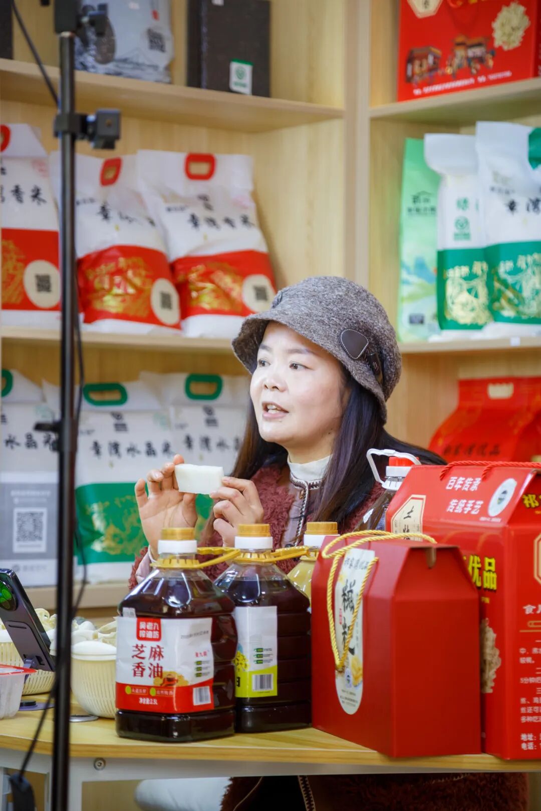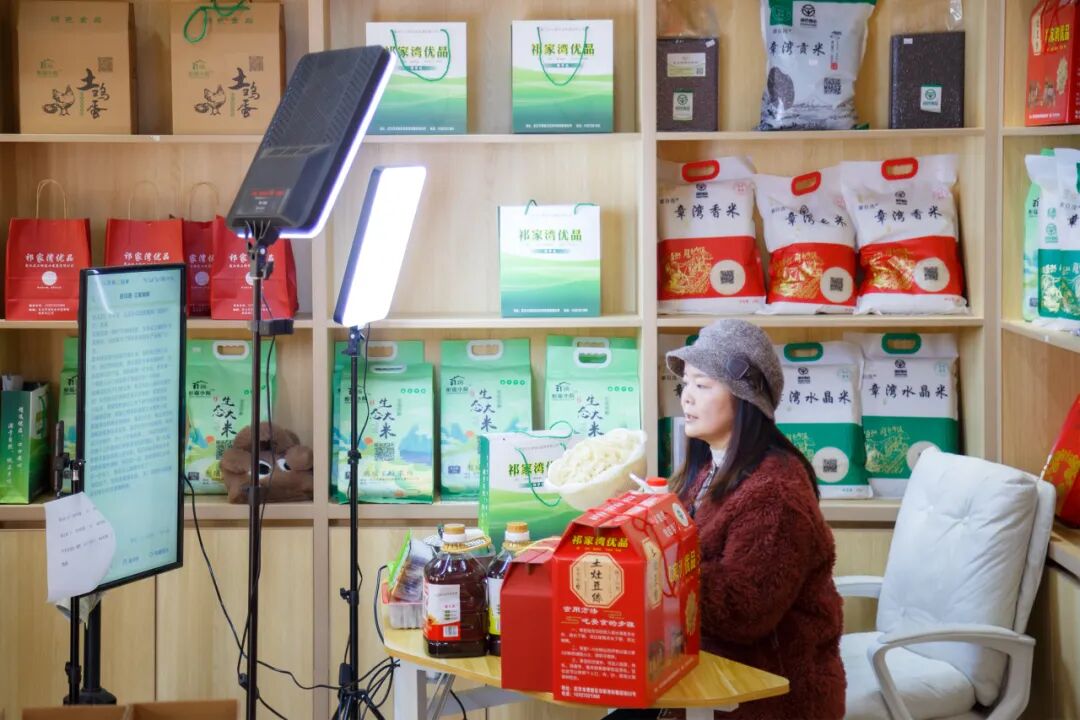 直播基地總面積達300㎡,是街道精心打造的綜合性農(nóng)業(yè)服務窗口,依托武漢云上耕農(nóng)業(yè)發(fā)展有限公司搭建的優(yōu)質(zhì)供應鏈,匯聚了祁家灣及周邊十余家家庭農(nóng)場、合作社的二十余種特色產(chǎn)品——鮮榨菜籽油、優(yōu)質(zhì)大米等糧油調(diào)味,純散養(yǎng)土雞蛋、手工豆絲、風干魚等特色農(nóng)產(chǎn)品,應有盡有。