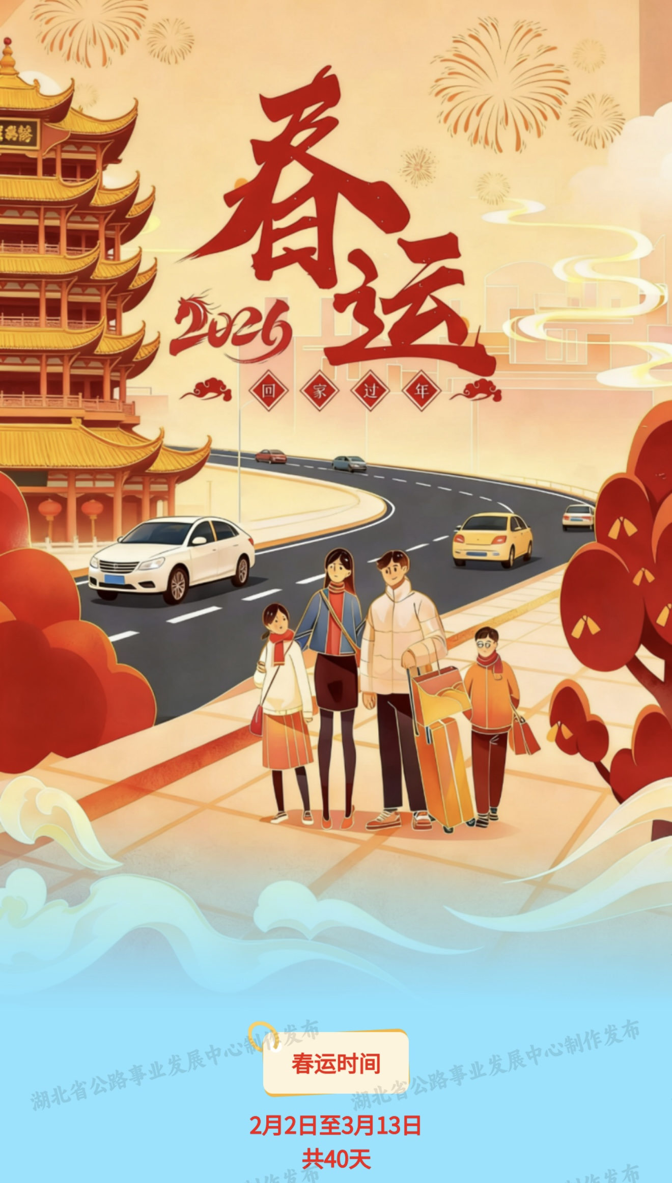 第二階段:春運(yùn)中期(2月15日至2月23日,共9天,春節(jié)期間)。春節(jié)期間,收費(fèi)公路對(duì)小型客車(chē)實(shí)行免收通行費(fèi)政策,流量以小型客車(chē)探親出行為主,貨運(yùn)車(chē)流主動(dòng)避峰,客車(chē)占比約為97%,貨車(chē)占比約為3%,路網(wǎng)流量特征呈前低后高趨勢(shì)。其中,2月15日、16日(臘月廿八、除夕),全省干線(xiàn)公路流量相對(duì)平穩(wěn);2月17日至19日(正月初一至初三),路網(wǎng)流量回暖上升,以武漢及各市州為中心向周邊縣市發(fā)散;2月20日至23日(正月初四至初七),預(yù)計(jì)返程車(chē)流相對(duì)集中,各縣市車(chē)流向重點(diǎn)城市匯聚,潮汐特征明顯。此階段是春運(yùn)期間日均流量最大階段,并形成春運(yùn)期間第一波流量高峰,預(yù)判峰值日出現(xiàn)在2月22日(正月初六)。