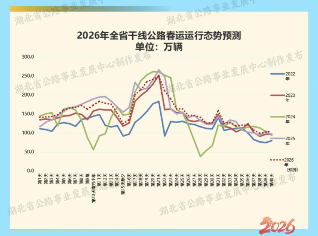 根據(jù)歷年來(lái)春運(yùn)車(chē)流規(guī)律分析,預(yù)判2026年春運(yùn)期間高速公路日均通行車(chē)輛出口流量,較2025年春運(yùn)同期增長(zhǎng)約4.7%;較2024年春運(yùn)同期增長(zhǎng)約16.9%,約為平日流量的1.5倍。其中,預(yù)判春運(yùn)期間全省高速公路跨省通行車(chē)輛日均出口流量,占春運(yùn)日均流量約17%;較2025年春運(yùn)同期增長(zhǎng)約7.6%,較2024年春運(yùn)同期增長(zhǎng)約22%。