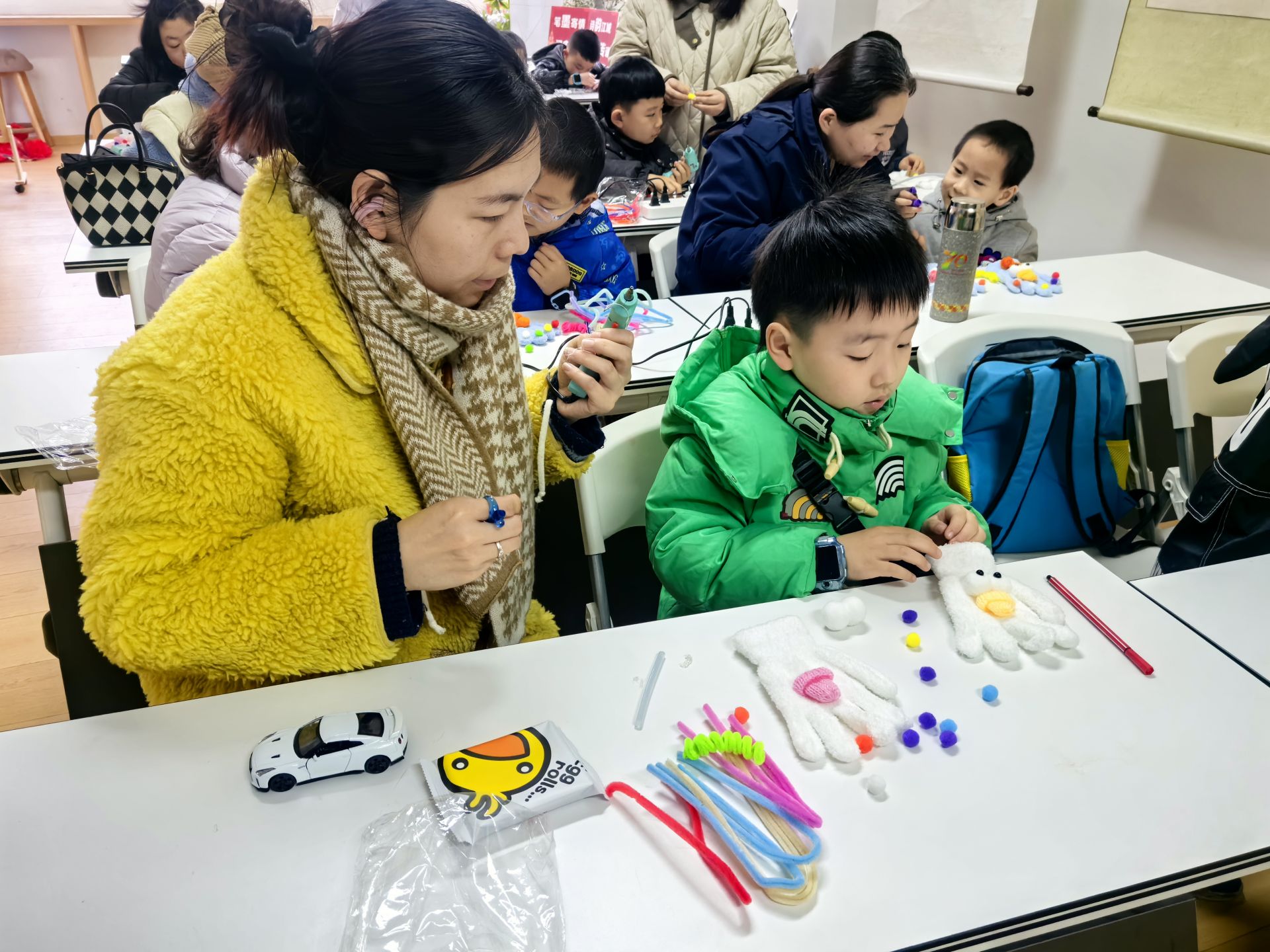 活動(dòng)圍繞傳統(tǒng)布藝展開,既保留了手工的韻味,又增添了童趣與實(shí)用性。書房為每個(gè)家庭準(zhǔn)備了精心搭配的材料包,柔軟的毛絨面料、五彩斑斕的小毛球、可隨意造型的彩色扭扭棒,還有一雙雙靈動(dòng)可愛的“小眼睛”貼片,讓零基礎(chǔ)的家庭也能輕松上手。