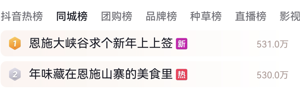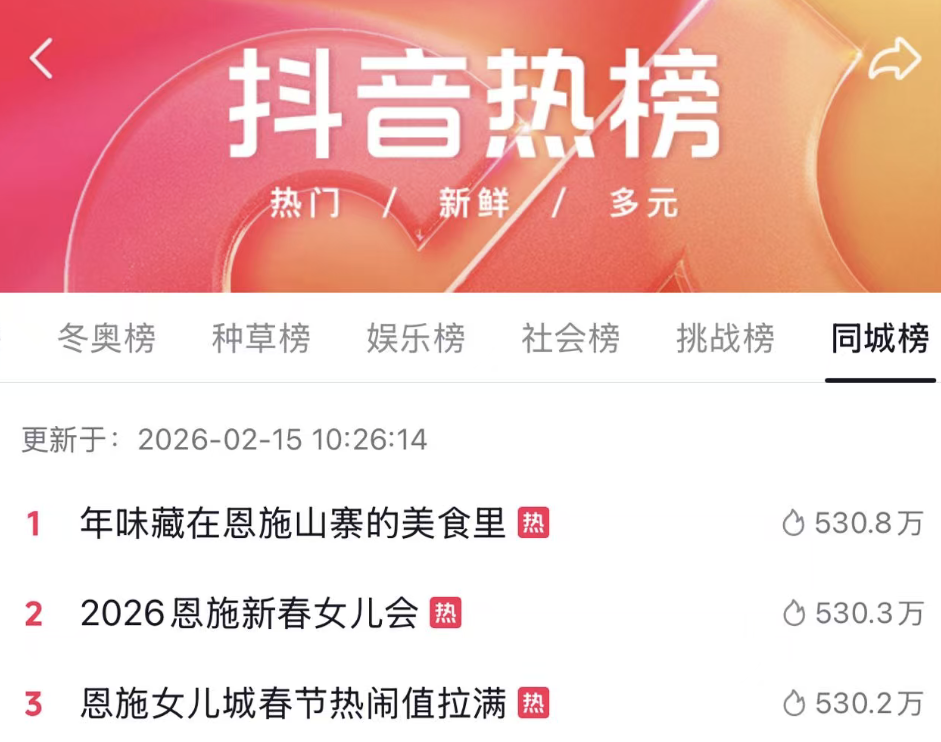 強大的宣傳矩陣,讓恩施火遍全網(wǎng)。打造的“恩施新春女兒會”“恩施女兒城春節(jié)熱鬧值拉滿”“年味藏在恩施山寨的美食里”“恩施大峽谷求個新年上上簽”四大熱點事件,強勢霸占抖音同城榜前三超10天。構建“主話題+子話題+互動話題”三級抖音傳播體系,#新春女兒會#2026我看過的燈會#刷NPC闖關賺銀票#來女兒會領個同頻搭子等4大熱點話題總瀏覽量達1.69億。