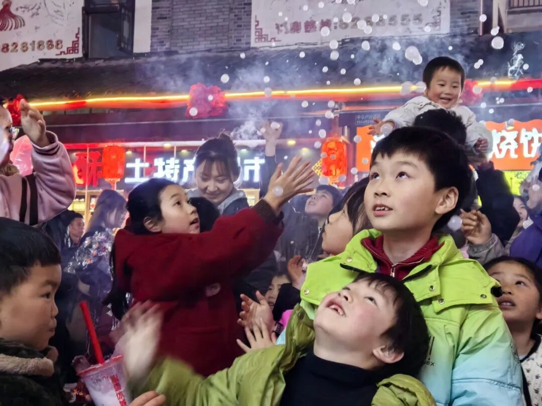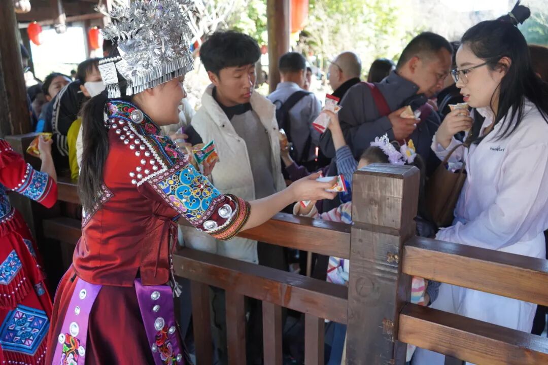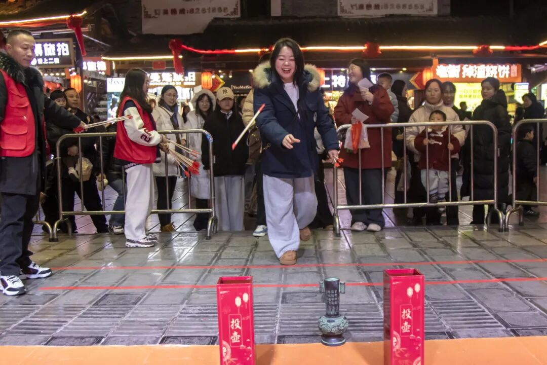 創(chuàng)新推出“新春銀票”實景游戲,活動現(xiàn)場顏值與實力雙在線的上官婉兒、李清照、孫權、財神爺?shù)萅PC穿梭這和游客玩成語接龍、投壺、華容道等趣味游戲。游客贏得的“銀票”可兌換摔碗酒、打糍粑等民俗體驗,換取恩施特產(chǎn)、文創(chuàng),還能參與抽獎贏折疊手機、口袋相機。來自重慶等地的游客第一天就抽取到幸運大獎,來恩施過年的興奮無以言表。景區(qū)內設置的“立馬回童年”“奇跡仙蹤”懷舊區(qū),踢毽子、丟福袋等小游戲,勾起不少游客的童年回憶。