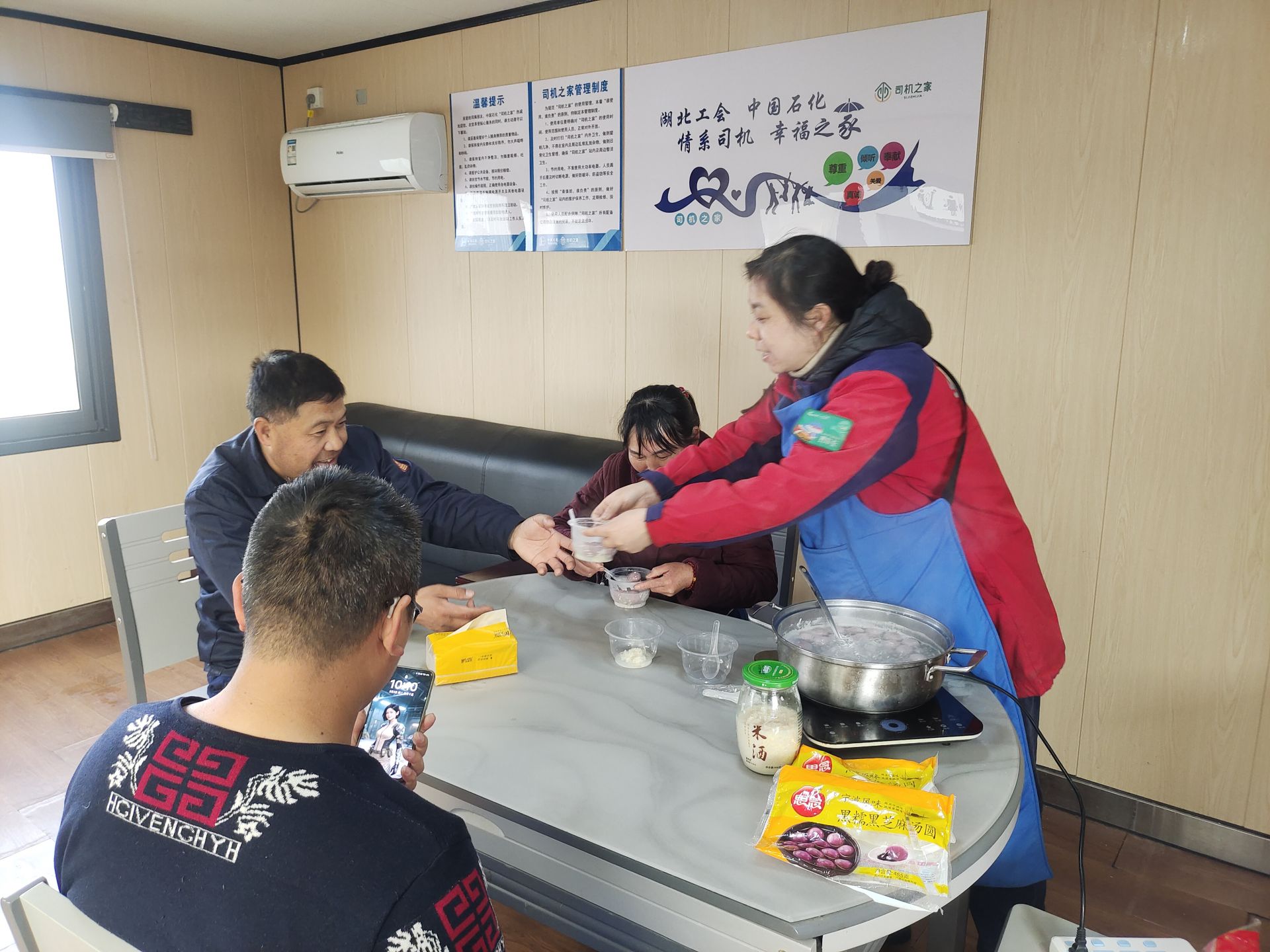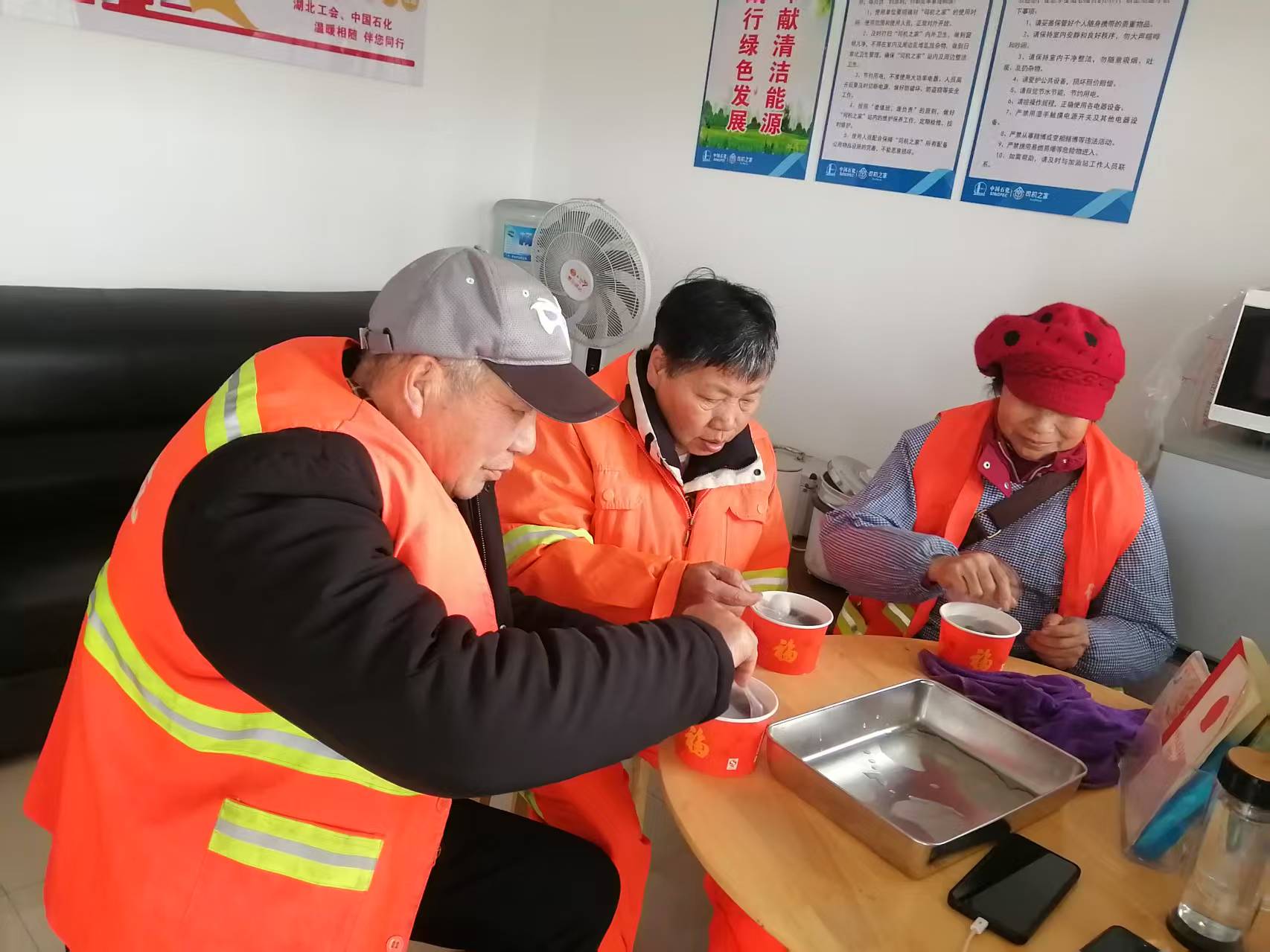 同樣的溫暖,也在應(yīng)城開發(fā)區(qū)加能站“愛心驛站”傳遞。當(dāng)日上午10時(shí),剛結(jié)束早高峰路段清掃工作的環(huán)衛(wèi)工人受邀進(jìn)站休息,該站的員工們熱情端上剛出鍋的湯圓,并準(zhǔn)備好休息座椅和熱茶。