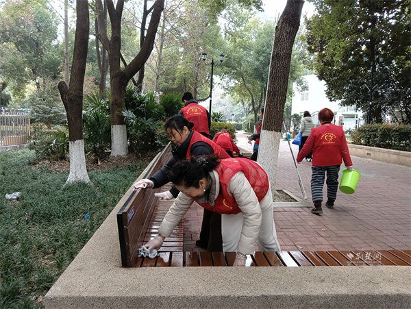 志愿者擦拭公共休閑椅。 通訊員供圖