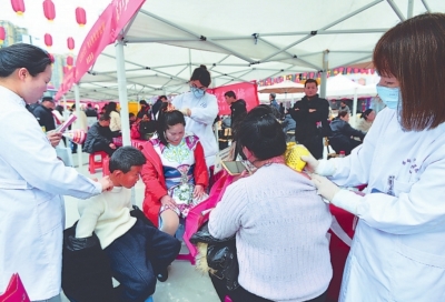 蔡甸區(qū)中醫(yī)院的醫(yī)護(hù)人員為居民刮痧診療。