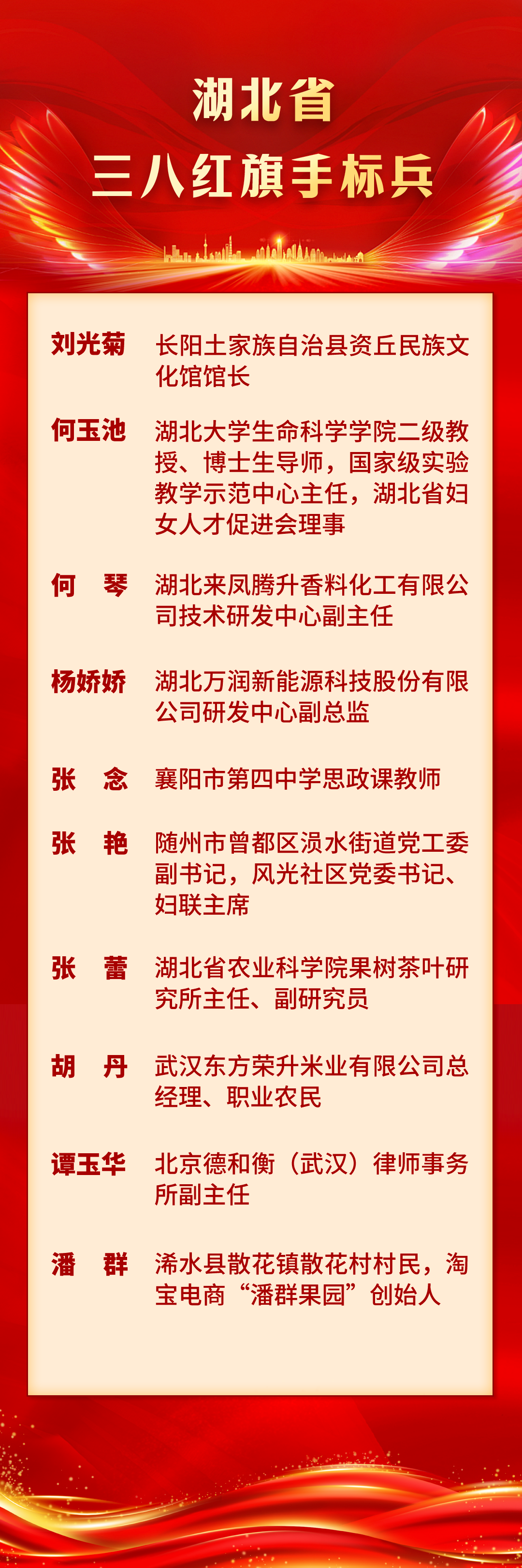 為表彰先進(jìn)、樹(shù)立榜樣,充分發(fā)揮先進(jìn)典型的示范引領(lǐng)作用,激勵(lì)全省廣大婦女以更加昂揚(yáng)的姿態(tài)聚力建支點(diǎn)、實(shí)干開(kāi)新局,湖北省人力資源和社會(huì)保障廳、湖北省婦女聯(lián)合會(huì)決定,授予劉光菊等10人湖北省三八紅旗手標(biāo)兵稱號(hào);授予董凌莉等90人湖北省三八紅旗手稱號(hào);授予武漢市自然資源保護(hù)利用中心江南分中心等70個(gè)單位湖北省三八紅旗集體稱號(hào)。