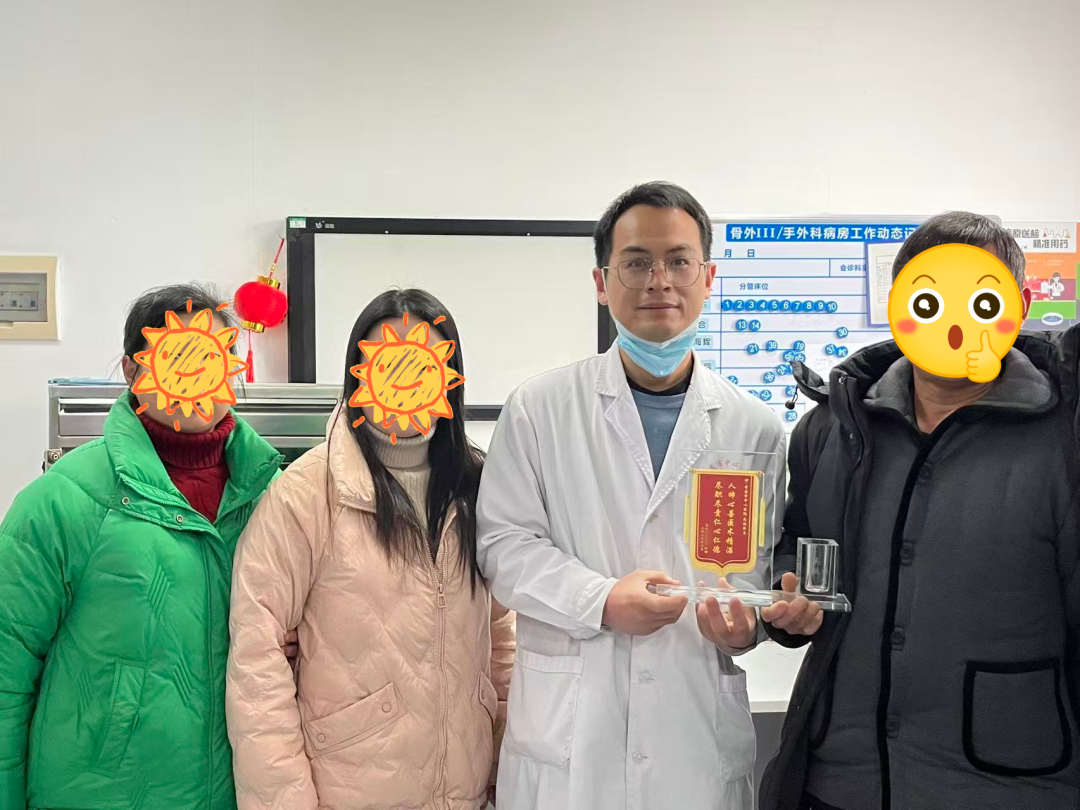 為最大限度保留患者手指功能,醫(yī)療團隊立即制定個性化手術(shù)方案。手術(shù)從當(dāng)日白天持續(xù)至夜間,吳航在顯微鏡下精準(zhǔn)開展清創(chuàng)、骨支架重建、肌腱縫合、血管神經(jīng)吻合及皮膚修復(fù)等一系列操作。術(shù)后經(jīng)過精心的護理,龍先生再植的三根手指全部存活,傷口及植皮區(qū)域愈合良好。為了表示感謝,龍先生專程從云夢趕到醫(yī)院,向吳航送上一面水晶錦旗,動情地表示:“多虧了吳醫(yī)生,才讓我的三個手指全部保住了!”