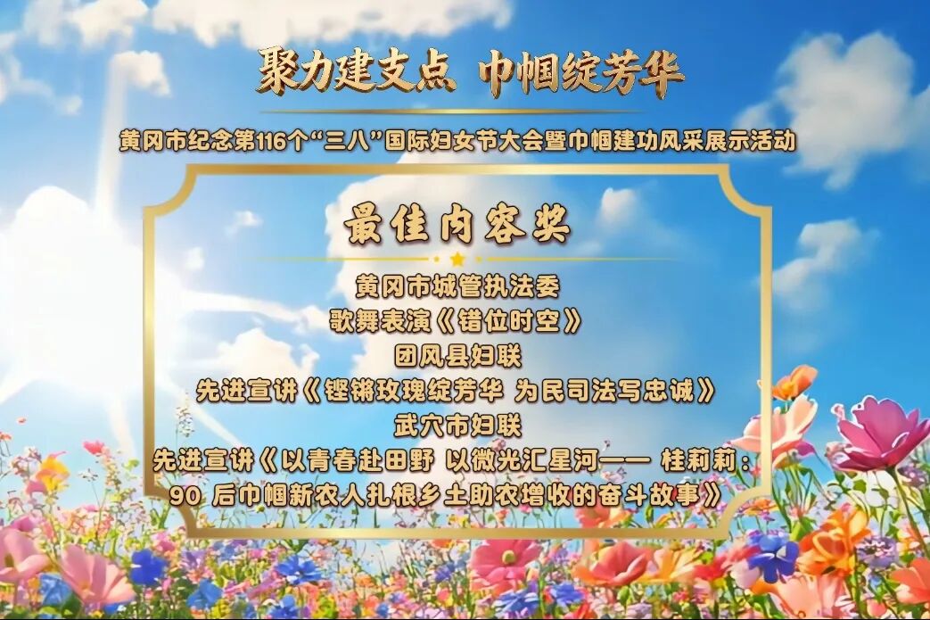 隨后,經(jīng)評(píng)委現(xiàn)場(chǎng)專業(yè)評(píng)審,活動(dòng)評(píng)選出最佳創(chuàng)意獎(jiǎng)、最佳內(nèi)容獎(jiǎng)、最佳表現(xiàn)獎(jiǎng)、最佳風(fēng)采獎(jiǎng)、最佳組織獎(jiǎng)五大獎(jiǎng)項(xiàng),以此致敬巾幗榜樣的辛勤付出與執(zhí)著堅(jiān)守,傳遞對(duì)每一位女性的敬意與期許。本次盛會(huì)不僅是一場(chǎng)精彩紛呈的風(fēng)采展演,更是一次巾幗力量的集結(jié)與凝聚,向每一位立足崗位、奮勇爭(zhēng)先、不負(fù)韶華的黃岡女性致以崇高禮贊。