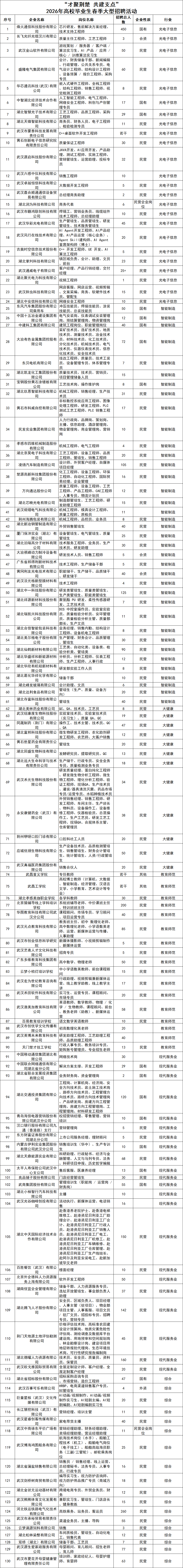 3月28日,“才聚荊楚·共建支點(diǎn)”2026年高校畢業(yè)生春季大型綜合招聘會(huì)將在湖北大學(xué)舉行。本次招聘會(huì)集結(jié)了東風(fēng)奕派、烽火通信、長(zhǎng)飛光纖等一大批重點(diǎn)企業(yè),將釋放超過(guò)10000個(gè)優(yōu)質(zhì)崗位。