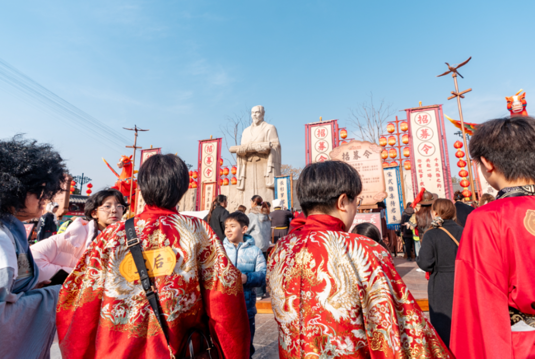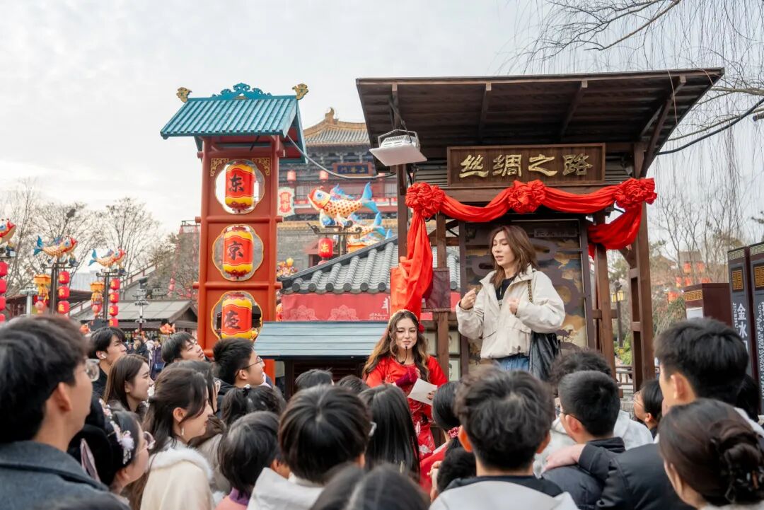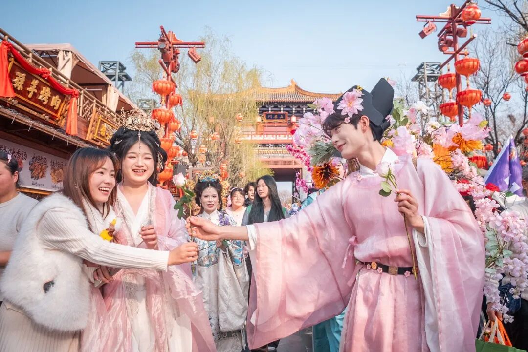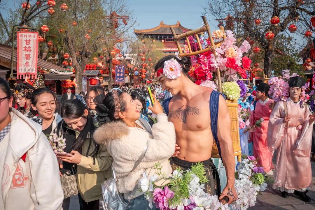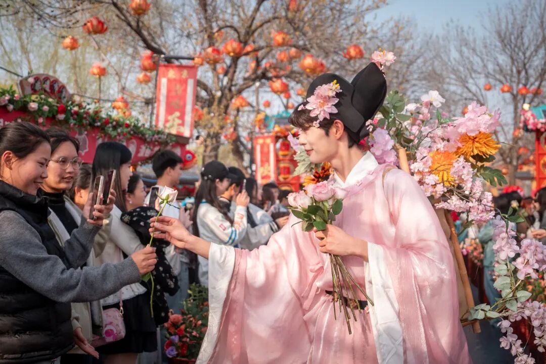 在這里,男子簪花盡顯灑脫,正如歐陽修筆下“戴花持酒祝東風(fēng)”的自在。宋式青衫的簪花兒郎,衣袂翩躚的簪花娘子,自清明文化廣場緩緩啟程,恰似《清明上河圖》里的市井風(fēng)雅鮮活走來,穿梭在園區(qū)各處,隨機(jī)“投喂”春日驚喜!