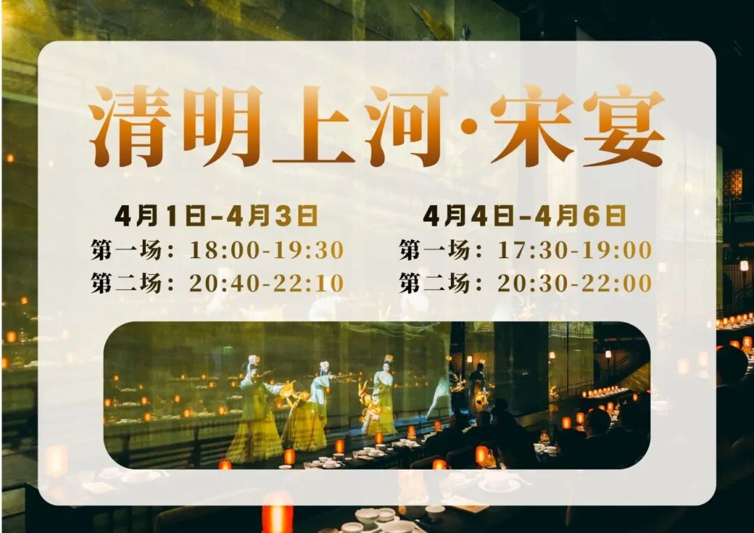 全國首個宋文化沉浸式餐秀,“雅致”與“市井”融于一席。八幕十場,移步換景;味是宋雅,亦是劇情。清明節(jié)假期,雙場晚宴預(yù)約開啟,共赴風(fēng)雅之約!品《清明上河·宋宴》沉浸餐秀,可3日內(nèi)免費(fèi)無限次暢游清明上河園。一盞宋瓷盛珍饈,一曲雅樂伴佳肴。雙場晚宴開席時間請查收~