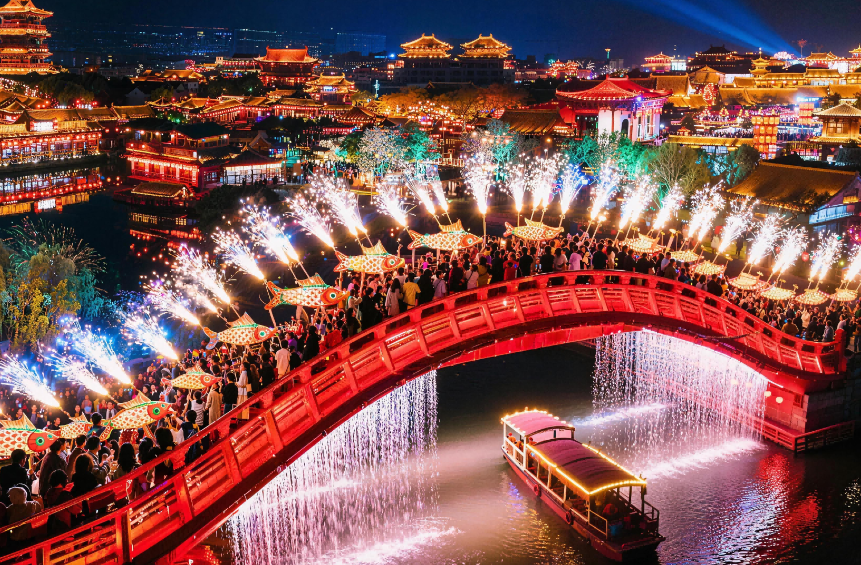 夜晚,清明上河園,化作辛棄疾筆下“一夜魚龍舞”的夢幻盛境。百萬盞花燈綿延,《魚燈大巡游》《國風(fēng)大巡游》《打鐵花之盛世大宋》《鳳舞九天飛天秀》《決戰(zhàn)汴梁城》《藥發(fā)傀儡·盛世焰歌》夜間好戲接連登場!