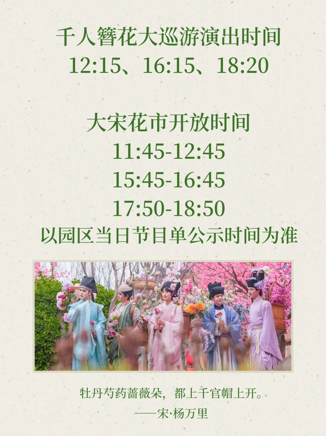 「大宋簪花游園會」歡樂剛剛開始!10000枝+繁花盛放、1000名+NPC沉浸互動、1000場+精彩好戲;簪花、赴宴、看戲、游園……清明假期倒計時4天!還等什么?這個清明假期,@你的踏青搭子,來清明上河園,赴一場日與夜的雙重美好。