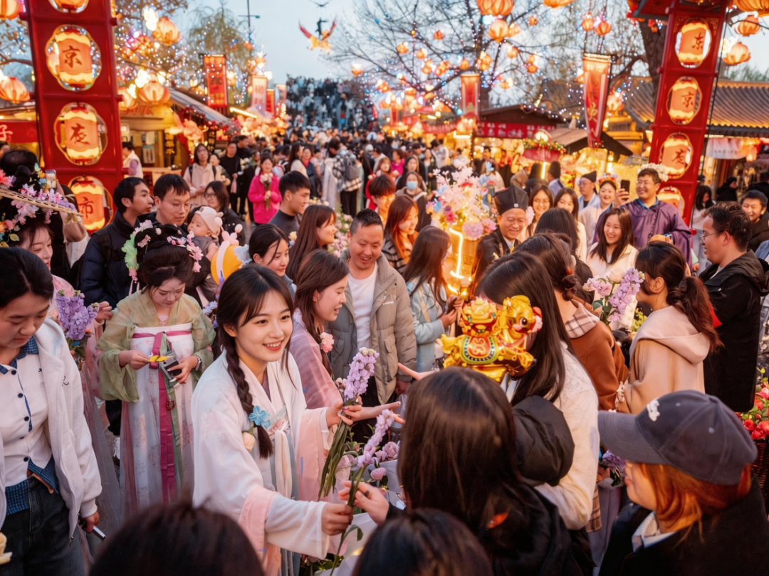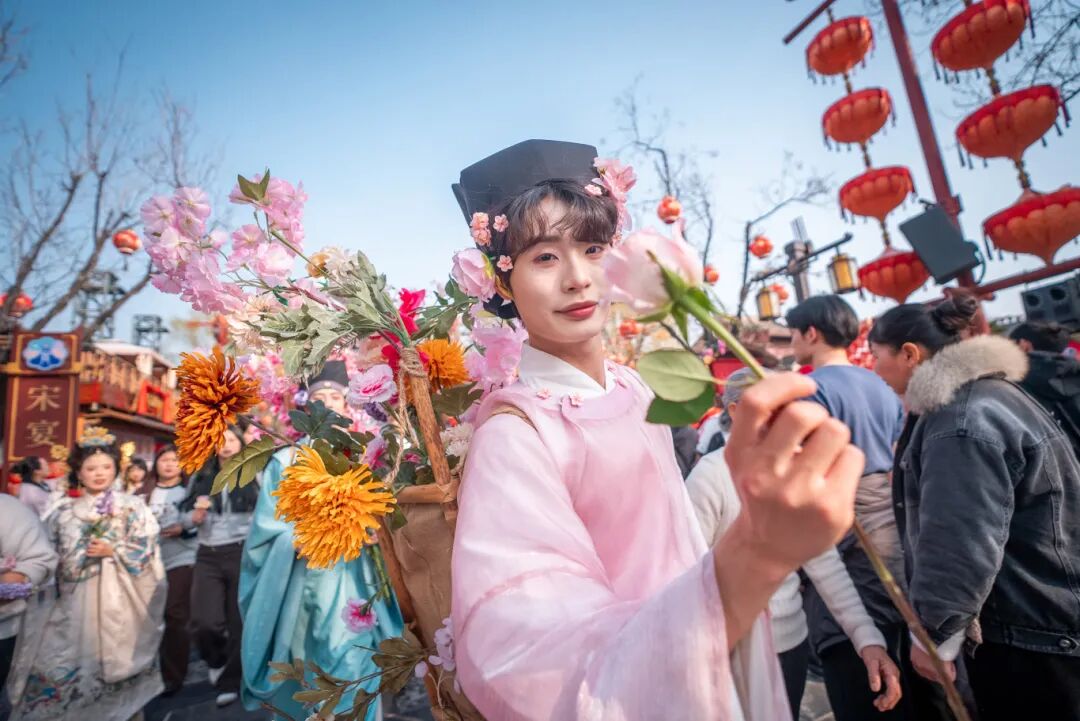 這里,滿城皆是簪花人!一步一花,步步生香。更是把春日浪漫拉到頂峰!花市之上,海棠、牡丹、芍藥、迎春綴滿攤位,淺粉、鵝黃、淡紫交織一片,攤主身著宋裝,手持花枝。不妨跟攤主互動一番,免費(fèi)獲得一朵鮮花,將春日溫柔收入囊中~