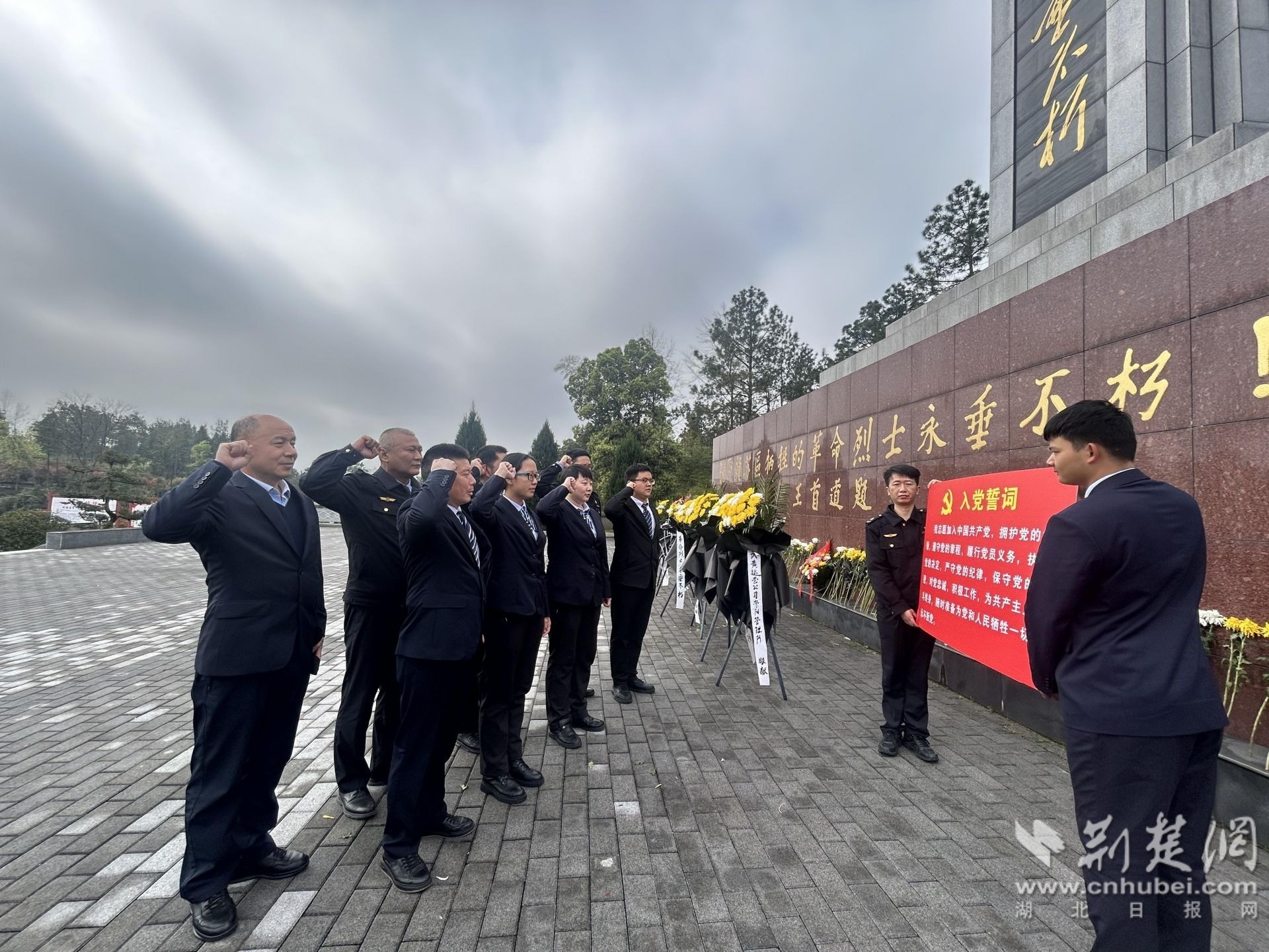 “我志愿加入中國共產(chǎn)黨,擁護(hù)黨的綱領(lǐng),遵守黨的章程……”祭掃尾聲,全體黨員面向烈士紀(jì)念碑,高舉右拳、莊嚴(yán)宣誓,鏗鏘有力的誓言回蕩在陵園上空,字字千鈞、擲地有聲。