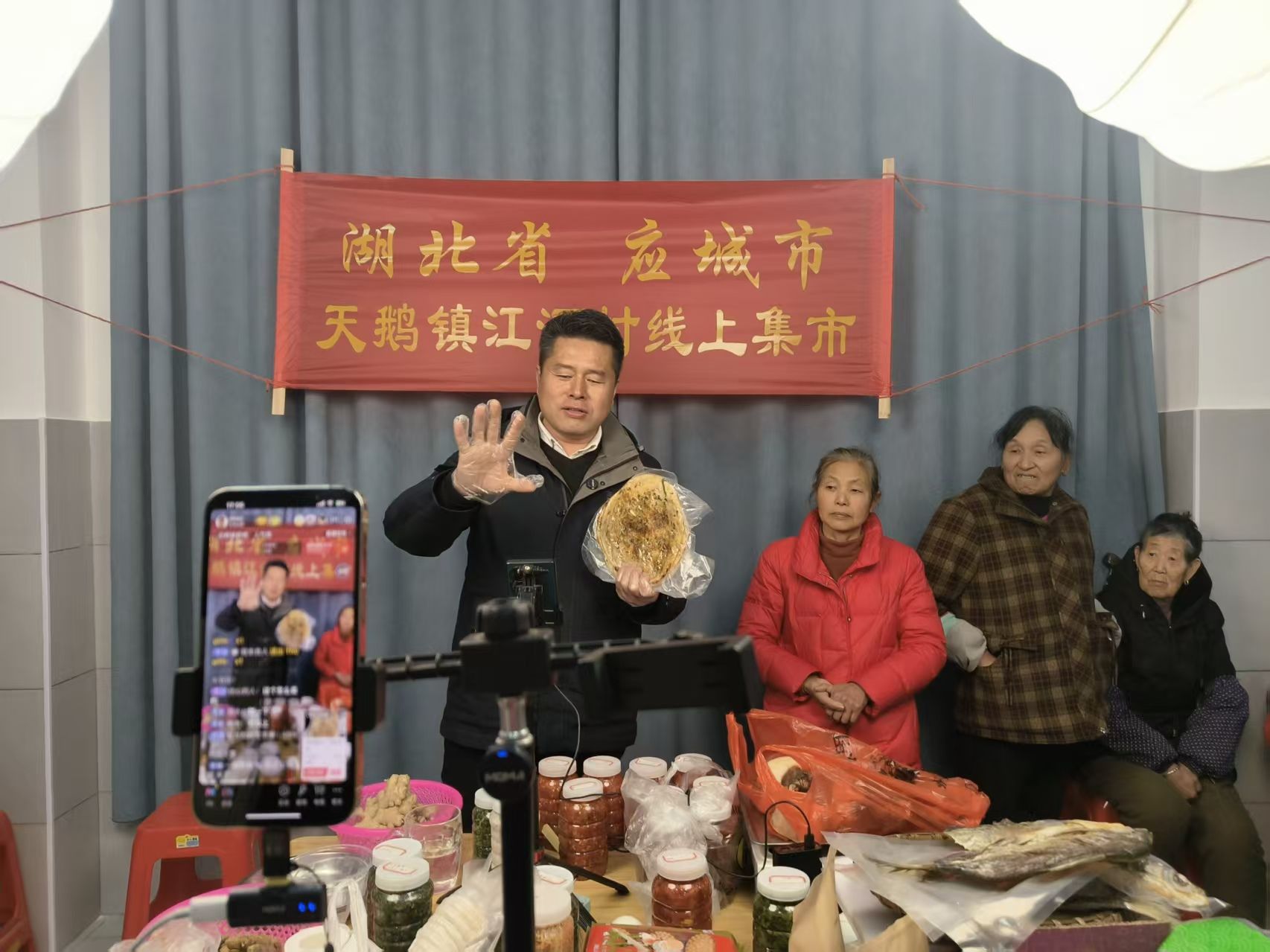 簡(jiǎn)單的辦公室內(nèi),一條印著“湖北省應(yīng)城市天鵝鎮(zhèn)江河村線上集市”的橫幅、一張辦公桌、一部手機(jī)、一盞補(bǔ)光燈,村干部們帶著平均年齡超過75歲的“銀發(fā)主播團(tuán)”開播了。
