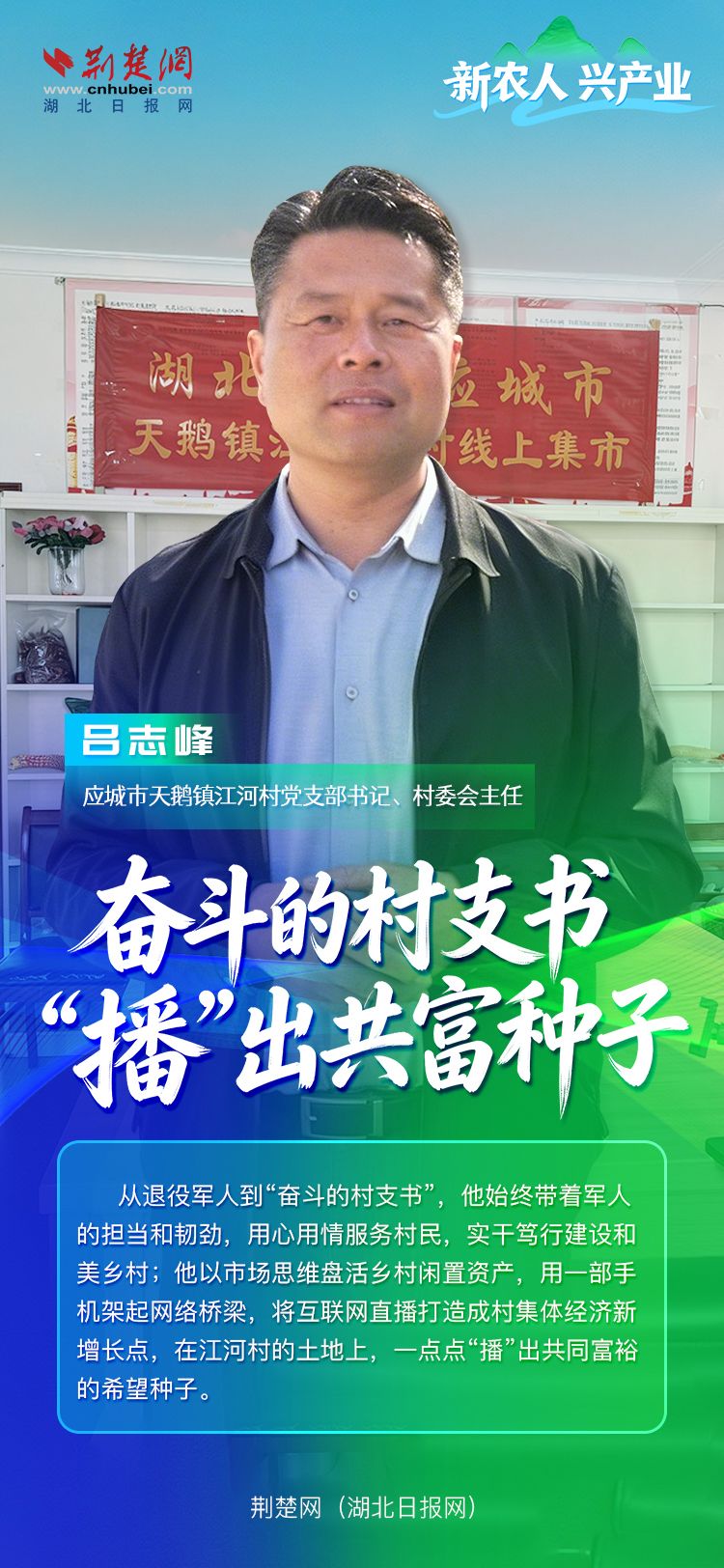一部手機(jī)、一個(gè)直播間,連接的是民心,點(diǎn)亮的是希望。從退役軍人到新農(nóng)人支書,呂志峰以新思維破局、以新舉措興業(yè)、以真情懷聚力,讓留守鄉(xiāng)村煥發(fā)勃勃生機(jī)。如今的江河村,路寬燈亮、環(huán)境優(yōu)美、鄰里和睦、日子紅火,而這位“奮斗的村支書”依然扎根鄉(xiāng)土,帶領(lǐng)鄉(xiāng)親們?cè)诠餐辉5牡缆飞戏€(wěn)步前行。