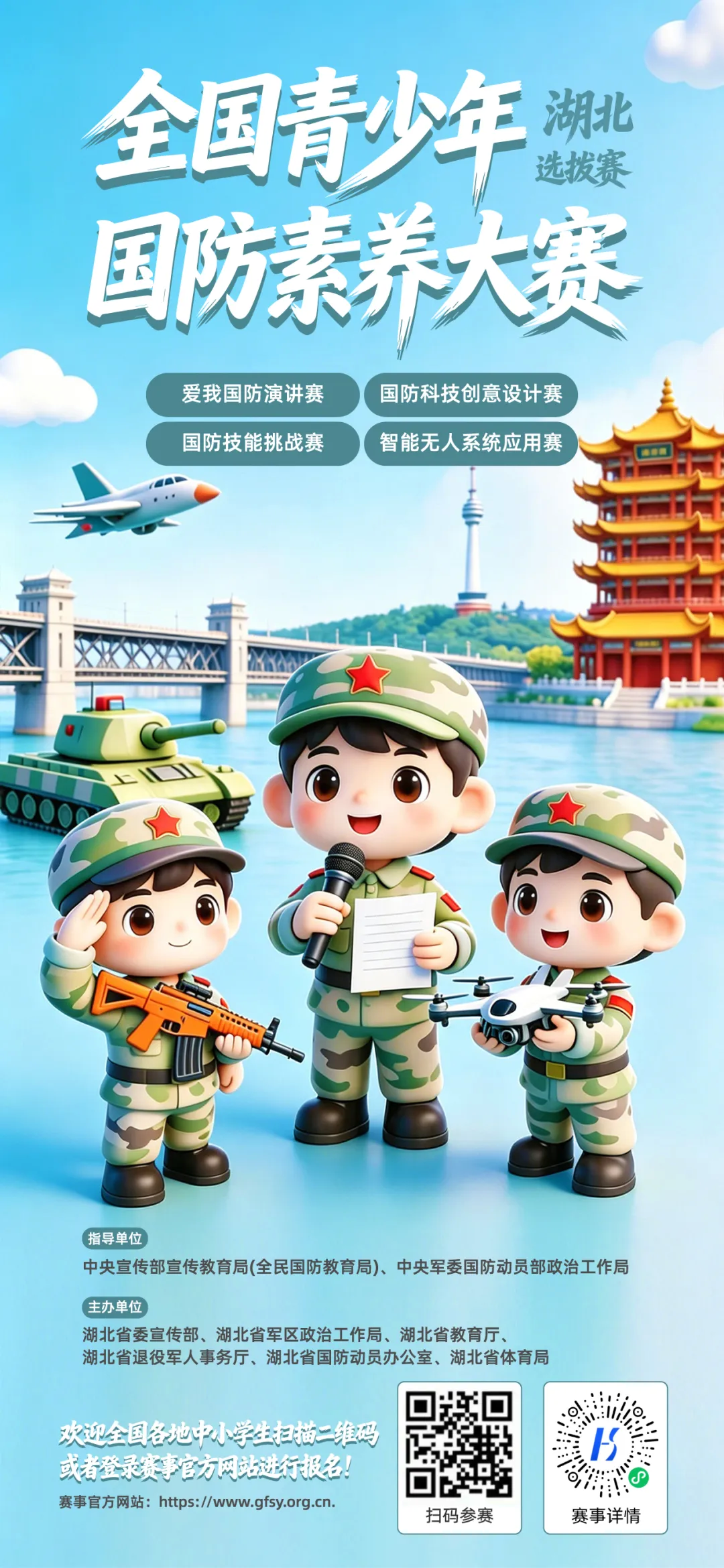 本次選拔賽由中央宣傳部宣傳教育局(全民國防教育局)、中央軍委國防動員部政治工作局指導,中共湖北省委宣傳部、湖北省軍區(qū)政治工作局、湖北省教育廳、湖北省退役軍人事務廳、湖北省國防動員辦公室、湖北省體育局聯(lián)合主辦,將充分結(jié)合湖北深厚的紅色文化底蘊與科教大省優(yōu)勢,通過一系列特色賽項,全面提升青少年的綜合國防素養(yǎng)與科技創(chuàng)新實踐能力。