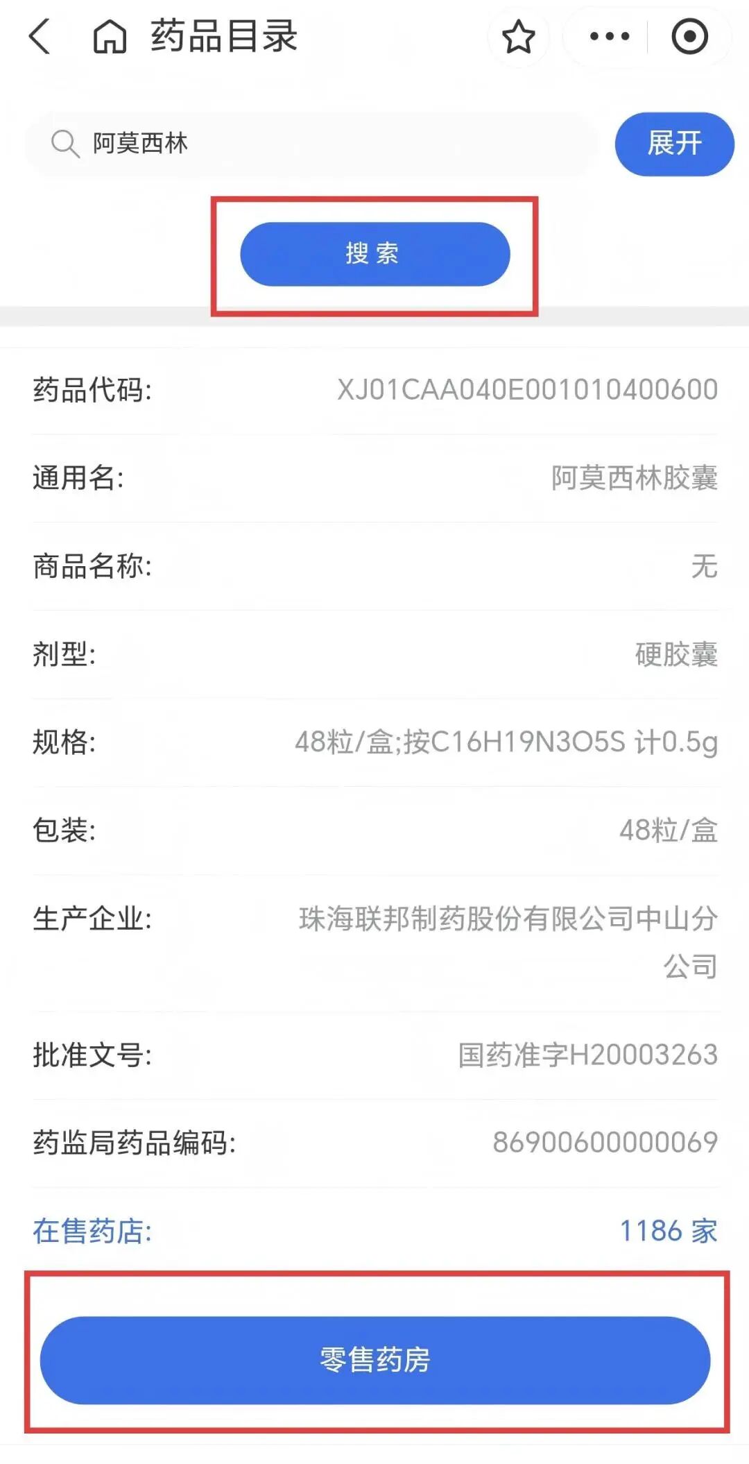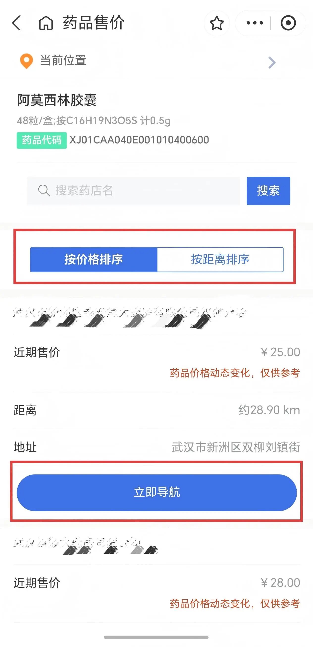 第四步:選定想購買的藥品,點擊“零售藥房”,系統(tǒng)顯示的信息按照價格、距離等條件進行升降序排列,比對同一種藥品在不同藥店的價格差異。