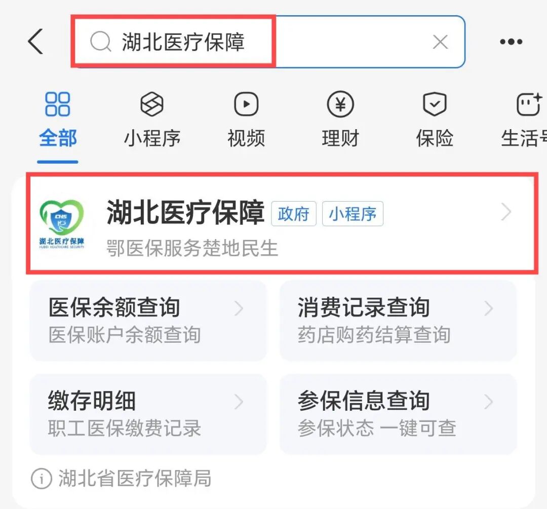 第一步:打開支付寶APP,搜索“湖北醫(yī)療保障”,進入小程序。