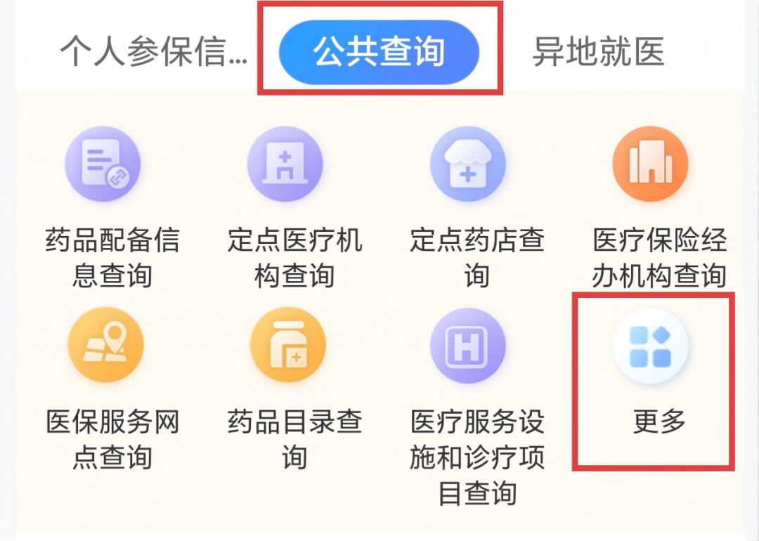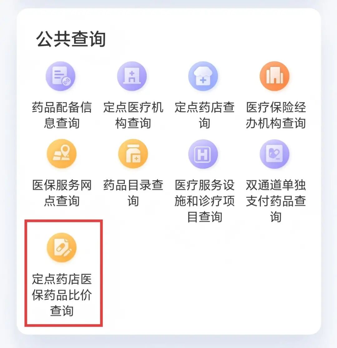 第二步:首頁找到【公共查詢】-【更多】,點擊【定點藥店醫(yī)保藥品比價查詢】,進入查詢界面。