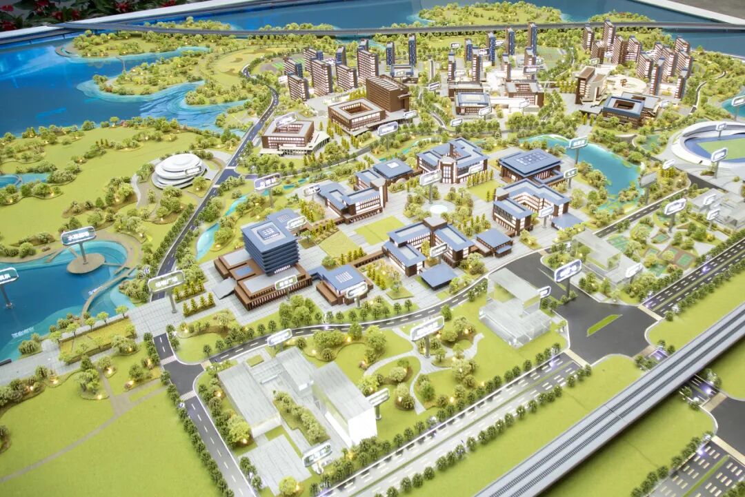 走進(jìn)校區(qū)展示中心,一座巨型沙盤(pán)在燈光映照下清晰勾勒出盤(pán)龍城校區(qū)的全貌。校區(qū)西臨府河濕地南接航城大道,北倚任凱湖畔,三面環(huán)湖的優(yōu)越區(qū)位一目了然。從沙盤(pán)上可以看到,教學(xué)樓、實(shí)驗(yàn)樓、圖書(shū)館、宿舍等建筑組團(tuán)錯(cuò)落有致,建筑群沿湖畔蜿蜒舒展,與自然水體有機(jī)交融。