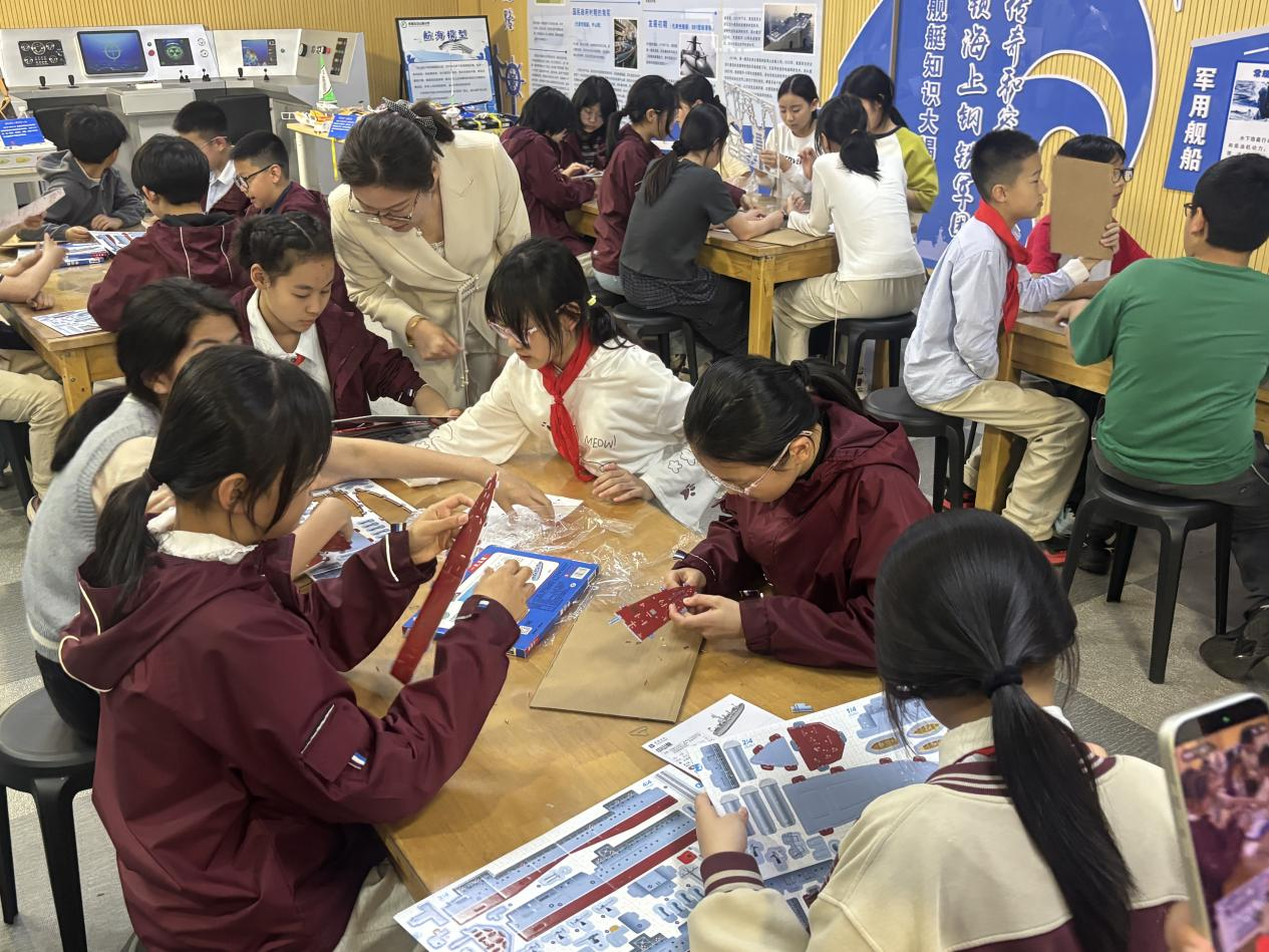 科技教室內(nèi),鄒姮老師指導(dǎo)學(xué)生進(jìn)行“團(tuán)隊(duì)合作 共制艦?zāi)!睂?shí)踐體驗(yàn)。同學(xué)們分組協(xié)作、分工拼裝中山艦紙質(zhì)模型,在動(dòng)手實(shí)踐中鍛煉動(dòng)手能力與團(tuán)隊(duì)精神,直觀感受中山艦的歷史厚重感與海軍精神。