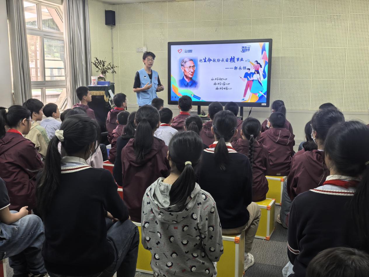 在音樂教室,中山艦博物館“志愿者大聯(lián)盟”成員單位武漢交通職業(yè)學(xué)院“北斗星志愿服務(wù)隊(duì)”的志愿者們,和同學(xué)們分享中國“兩彈一星”元?jiǎng)坠缿训母腥斯适?,讓“熱愛祖國、無私奉獻(xiàn)、自力更生、大力協(xié)同、勇于登攀”的“兩彈一星”精神,在少年心中落地生根、熠熠生輝。