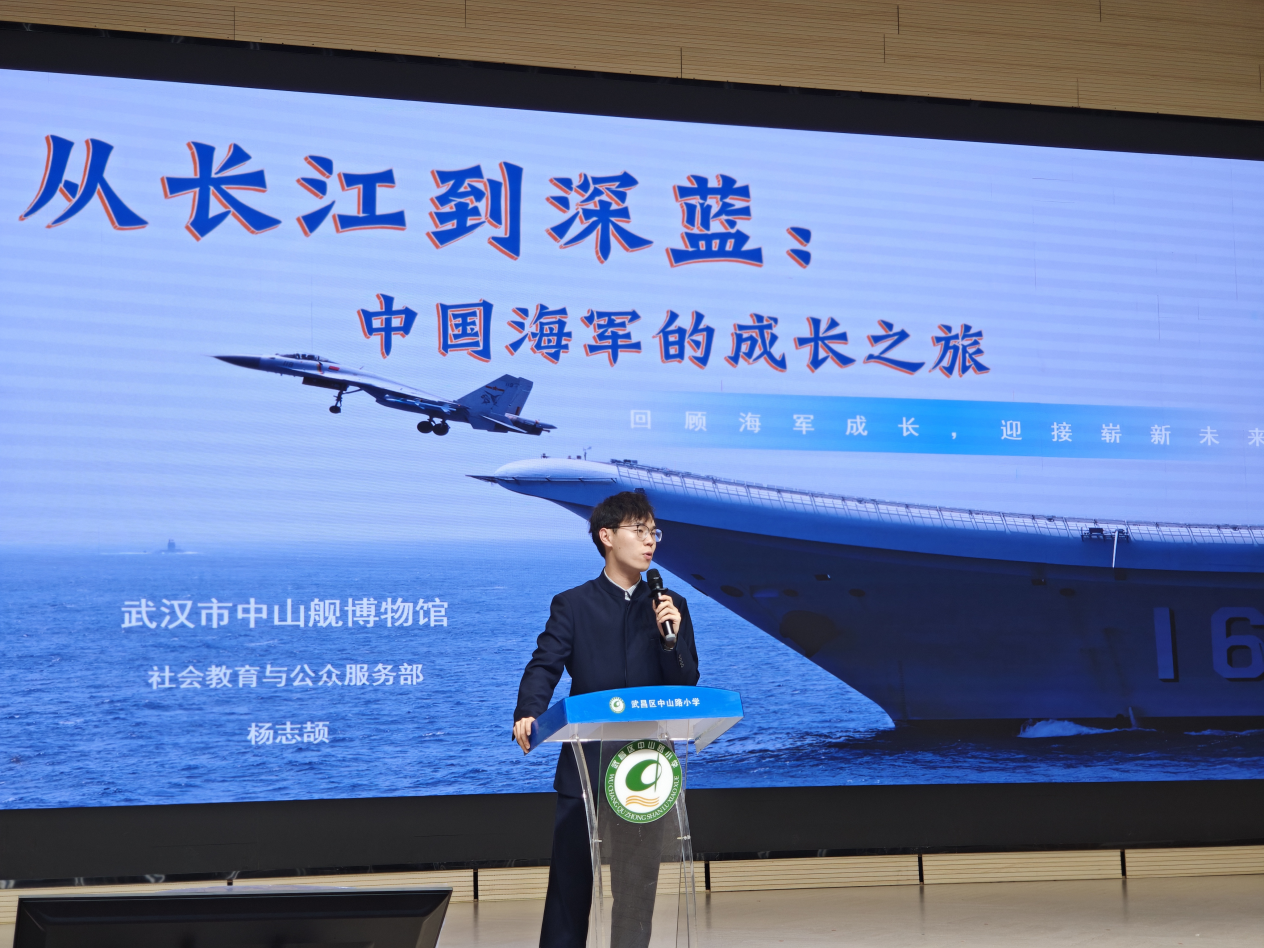 活動(dòng)現(xiàn)場,中山艦博物館社教部楊志頡老師帶來“從長江到深藍(lán)” 專題講座,以中山艦百年沉浮為脈絡(luò),系統(tǒng)講述中國海軍從近代海防到新時(shí)代挺進(jìn)深藍(lán)的發(fā)展歷程,通過視頻展示、互動(dòng)問答、趣味游戲等形式,讓歷史知識(shí)生動(dòng)可感,有效激發(fā)學(xué)生的學(xué)習(xí)熱情與愛國情懷。