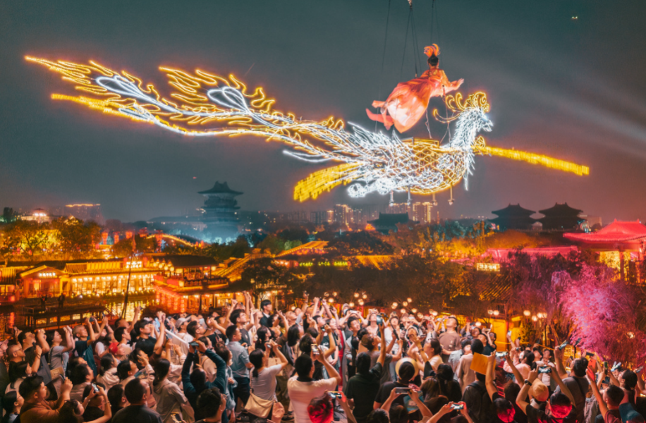 抬頭,別眨眼。全新震撼大秀《鳳舞九天》驚艷上線!以飛天威亞 + 鳳鳴之舞 +燈光勾勒 ,全景式演繹鳳凰飛天、盛世祥瑞的絕美畫面,再現(xiàn)大宋盛世華章。